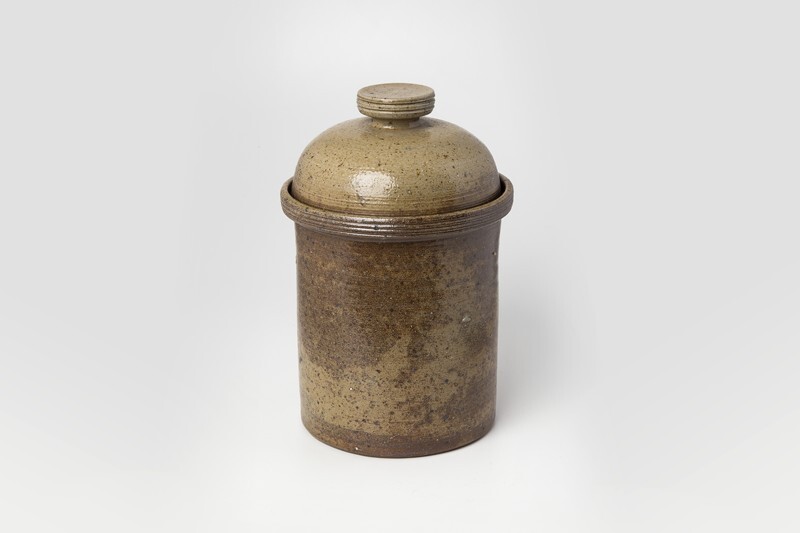 Pot met deksel, cilindrische wand met uitgelegde, geprofileerde, rechte wand, overdekt met bruingrijs zoutglazuur