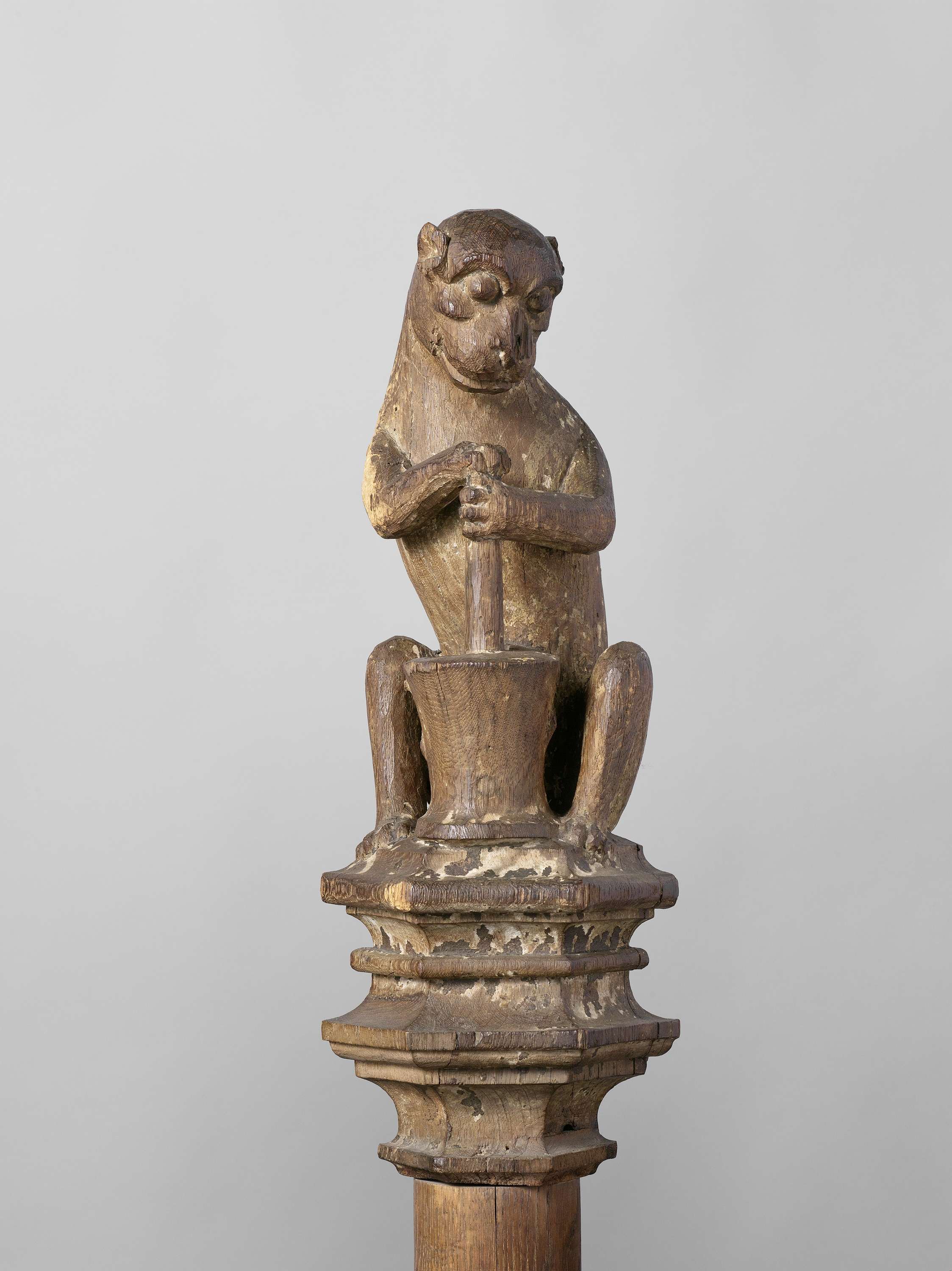 Beeldhouwwerk van dier of mens met wapenbord, zittend op een zuil. Het beeld hoort bij elf beelden (BK-NM-144-1 t/m BK-NM-144-12).
