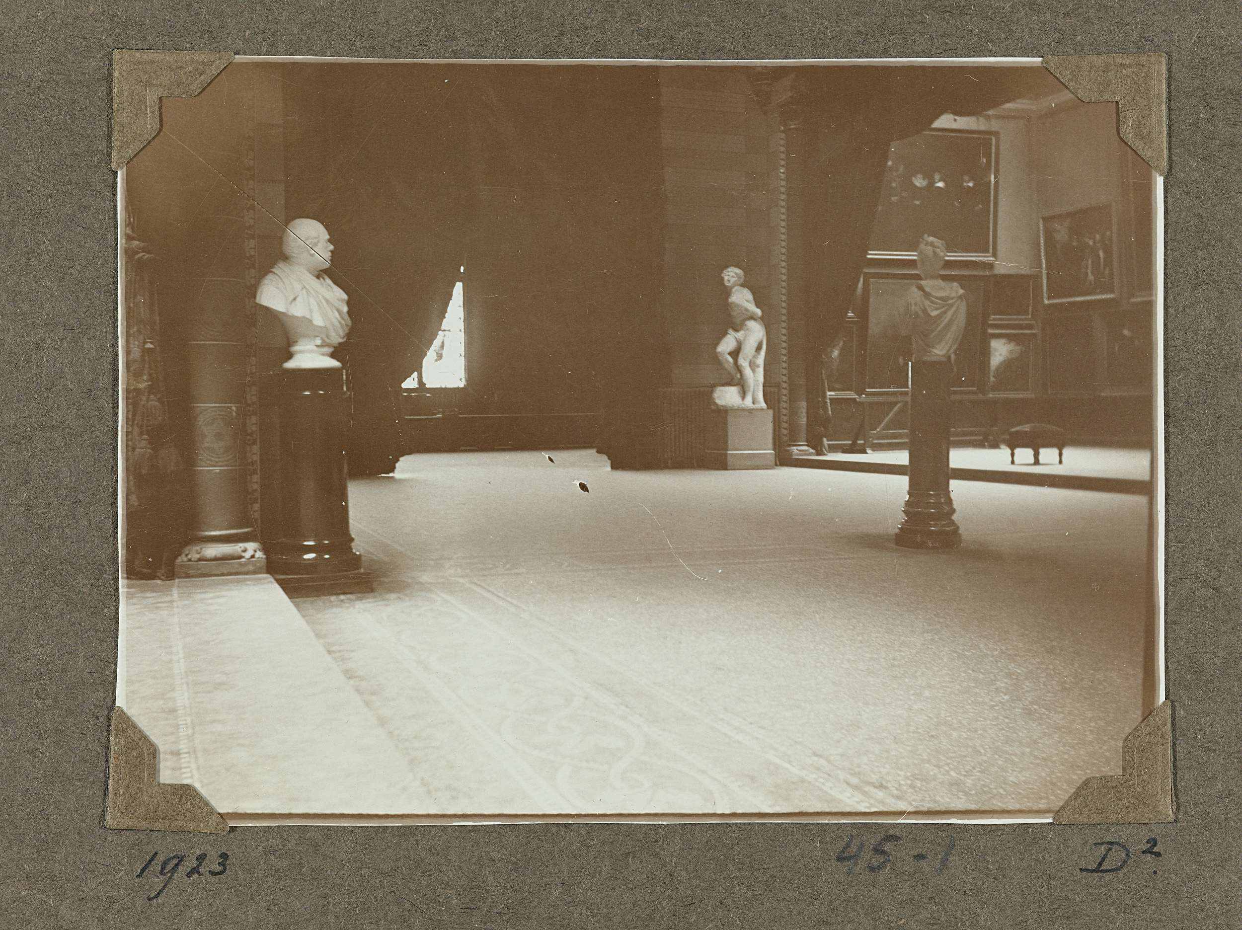 In de Eregalerij zijn aan een aantal pleistermodellen opgesteld. In de doorgang tussen de Eregalerij en de Voorhal hangen gordijnen. Vanuit kabinet 246 zicht op kabinet 247 aan de oostzijde van de Eregalerij. Eregalerij met zicht op oostelijke deel van kabinet 247. Het niveauverschil tussen de galerij en de kabinetten wordt in 1925 geëgaliseerd. Granitovloer ...