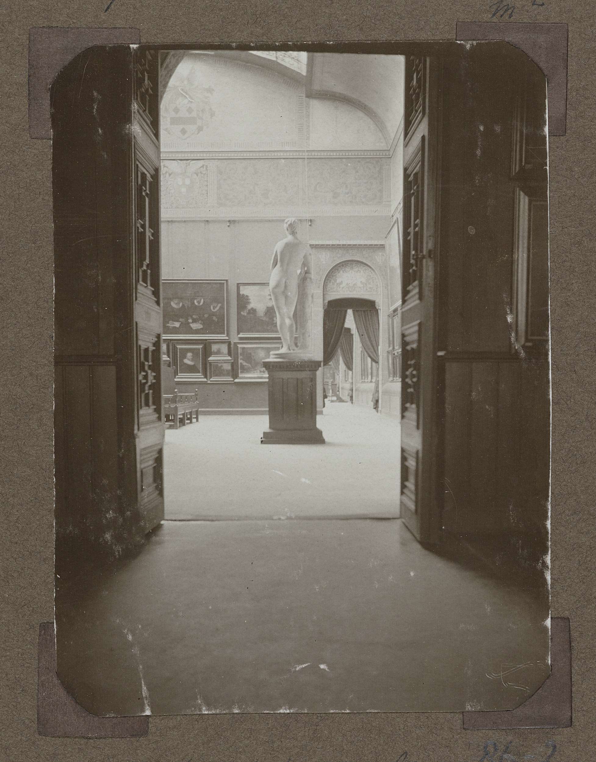 Door deuropening van zaal 220 naar 225 zicht op de achterzijde van het beeld 'De nimf Echo' van F. Leenhoff, dat in de doorgang van zaal 221 en 225 staat opgesteld. Boven de doorgang is het nummer van zaal 225 te lezen. In zaal 220 wordt de collectie Bicker en de anatomie-schilderijen getoond. De westelijke ...
