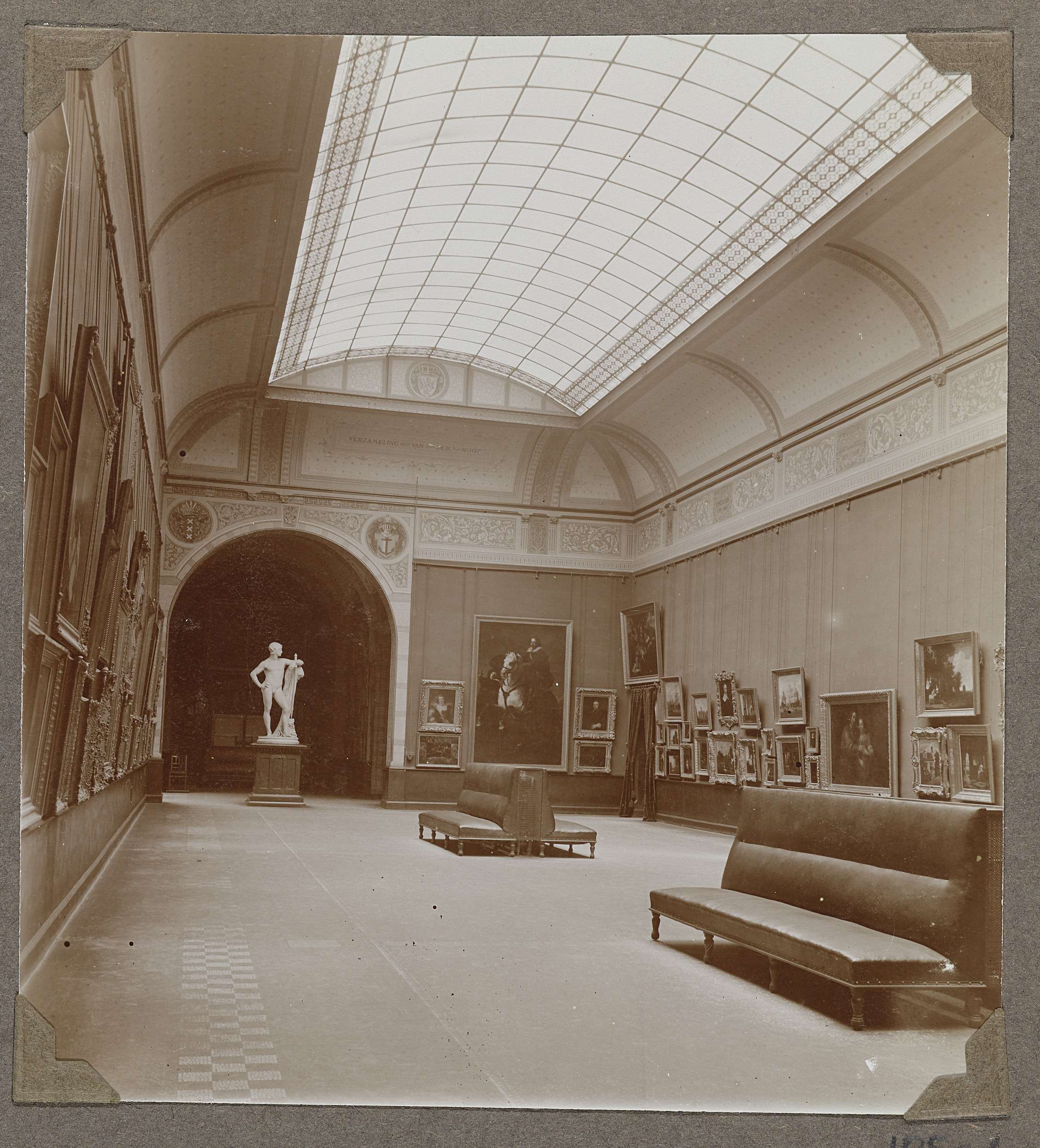 Grote zaal met de verzameling van de heer Adriaan van der Hoop, die in 1854 aan de Gemeente Amsterdam gelegateerd werd en in bruikleen afgestaan werd aan het Rijksmuseum. In de doorgang staat een marmeren beeld 'Perseus' door F. Leenhoff. Rechts aan de wand o.a. zicht op het 'Het Joodsche bruidje' van Rembrandt. In het ...