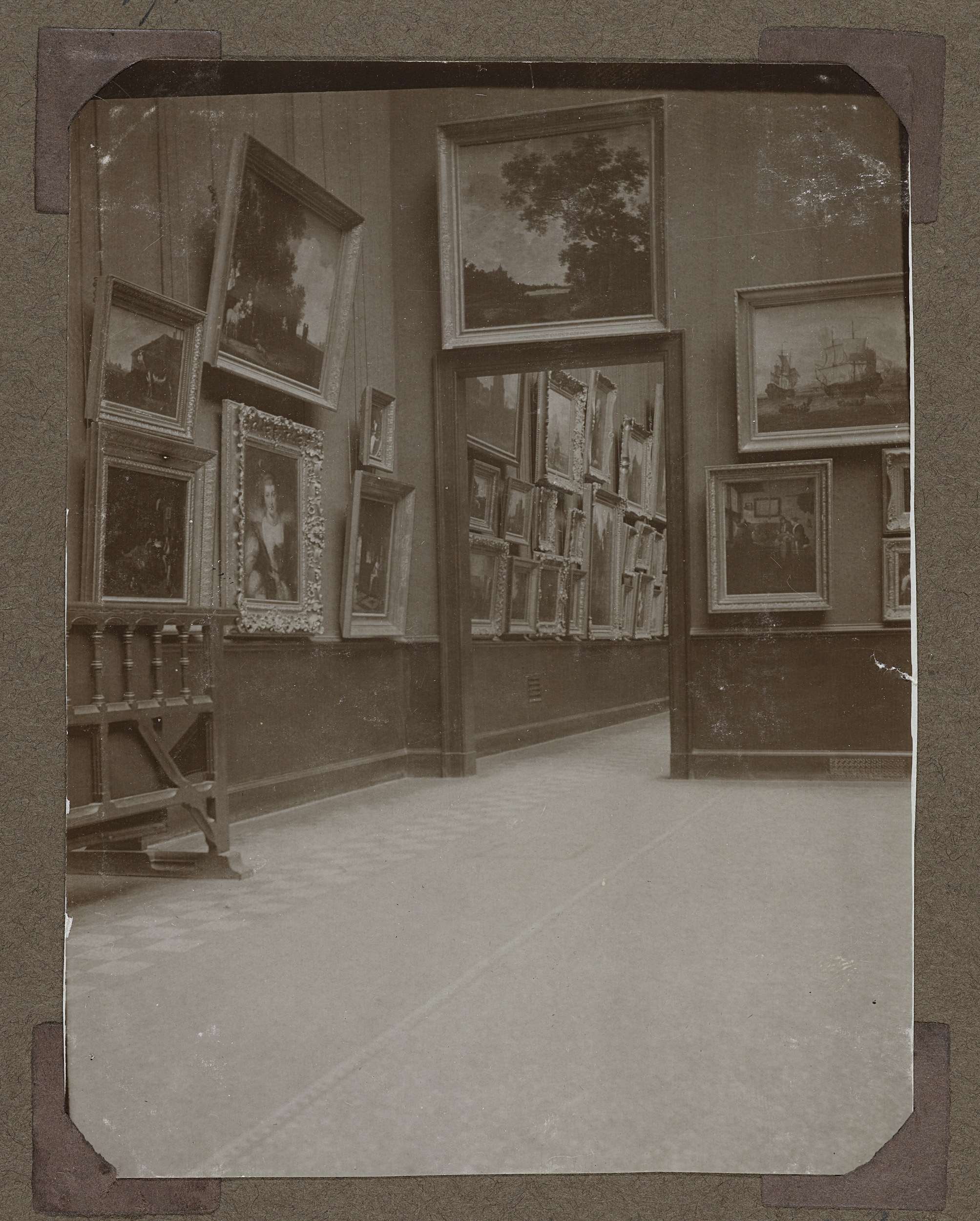 Hoek van zaal met doorgang naar volgende zaal. Boven de doorgang zicht op een schilderij van J. van der Haagen. Vergelijk met foto 104. Zelfde soort doorgang. In 1917 is de van der Hoopzaal verdeeld in drie ruimten. Dit is een van deze in 1917 gecreeerde ruimten.