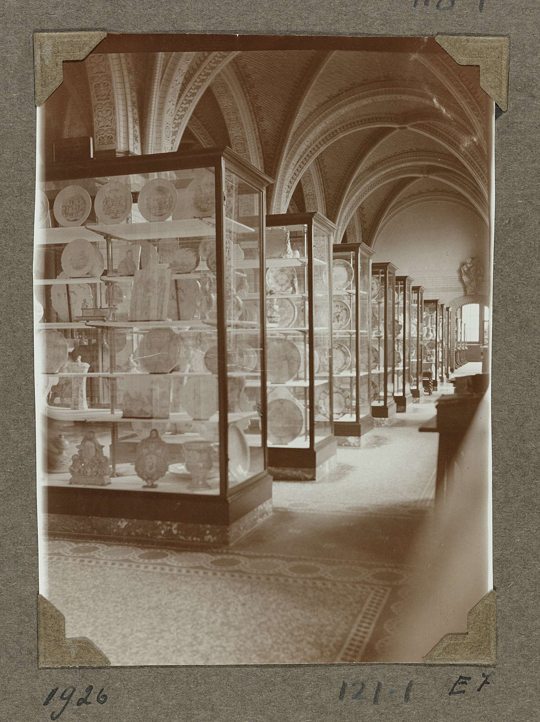 Ceramiekzaal met een lange rij toonkasten waarin o.a. de verzameling John F. Loudon getoond wordt. Serie foto's (nrs 117 t/m 128) van zaal 203, de porseleinzaal. (hier is de noordbeuk te zien waarin zich thans het publieksrestaurant D 125 bevindt). In 1928 is de 'Ceramiekzaal' omgedoopt tot 'Gotische Zaal'. Deze serie foto's dateert volgens bijschrift ...
