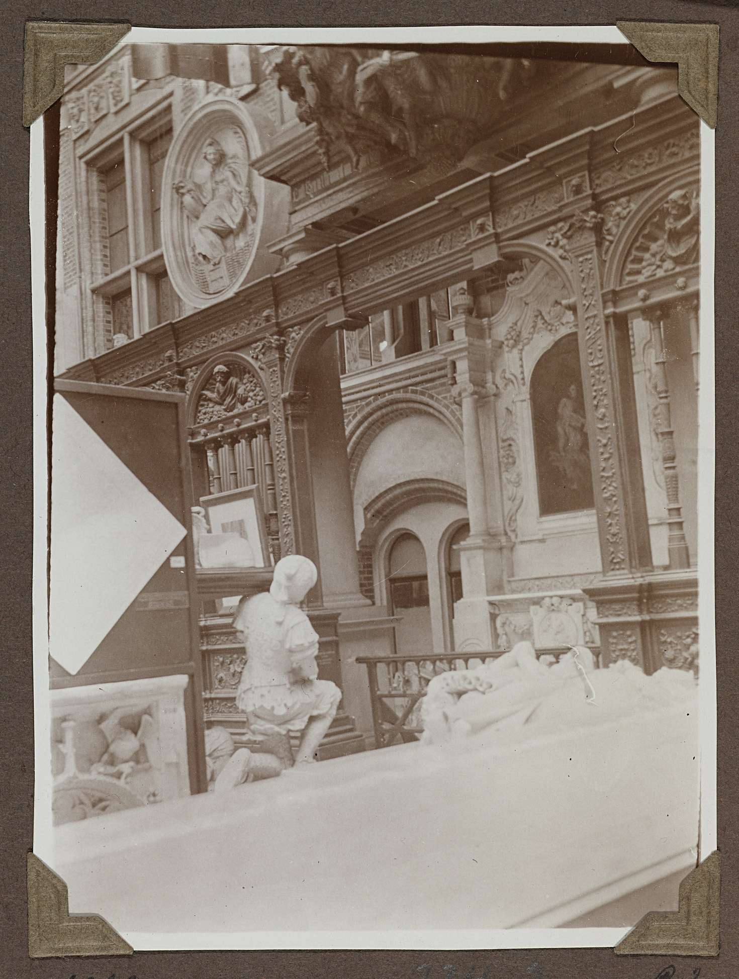 Gipsbinnenplaats met zicht op afgietsels van oa. één van de dragers van het grafmonument van Engelbert II, graaf van Nassau en zijn gemalin Cimburga van Baden en een koorhek uit 1542. Op de achtergrond aan de muur zicht op een medaillon met voorstelling van een vrouwefiguur. Westelijke binnenplaats.souterrain natuurstenen dubbele boogvensters, begane grond natuurstenen kruisvensters. ...