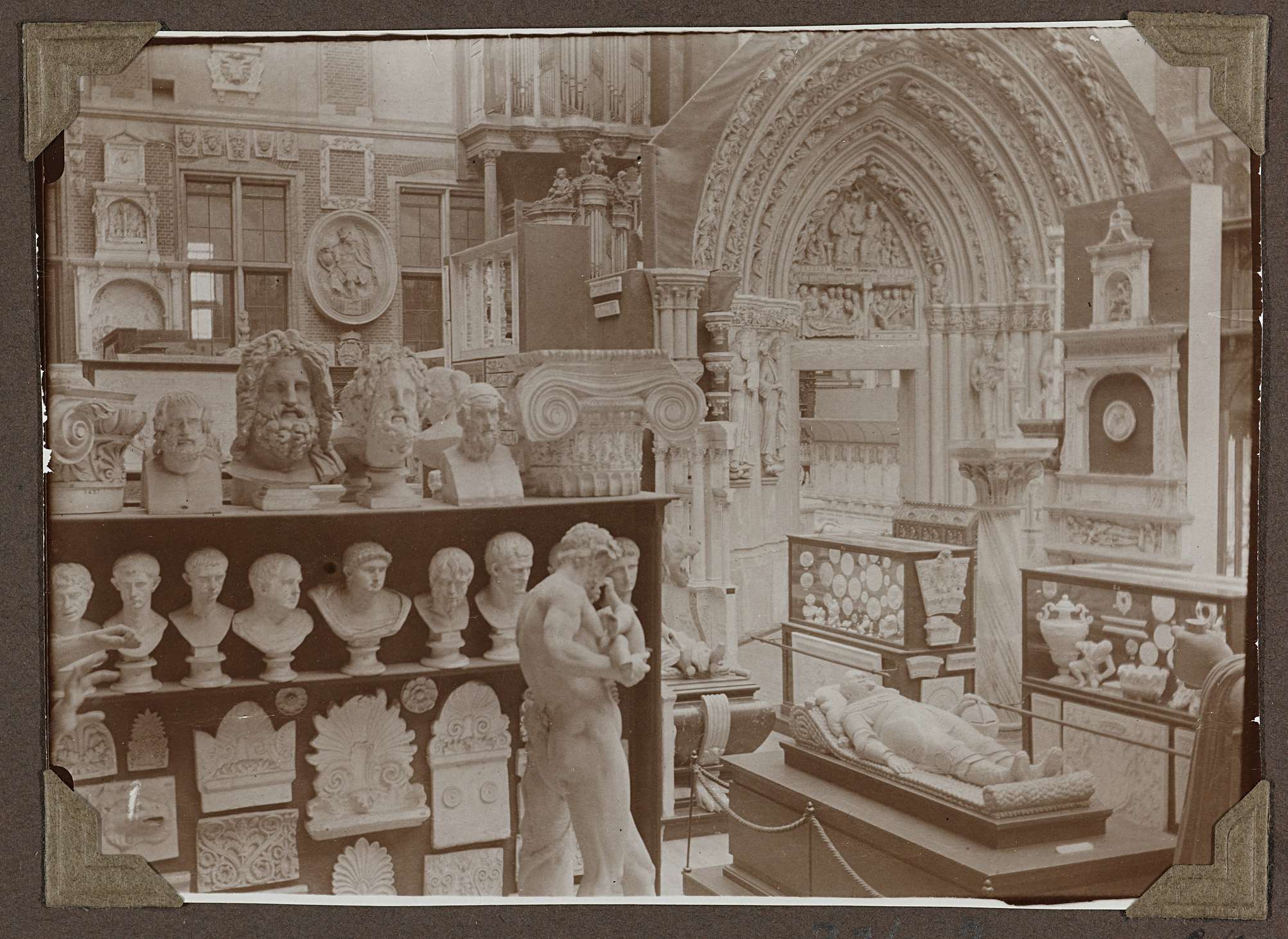 Rechts van het midden zicht op een praalgraf. Links op de voorgrond een toonkast met borstbeelden en gevelstenen en op de achtergrond zicht op het zuidelijk portaal van de Servaaskerk.