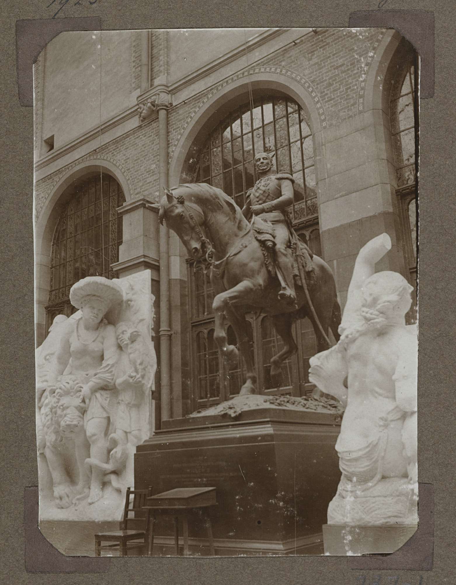 Op sokkel staat een gipsen ruiterbeeld van koning Willem II der Nederlanden. Links van dit beeld zicht op een pleisterafgietsel van een vrouw met een leeuw. Op de achtergrond is één van de blokvormige pilasters te zien waarop eerder een beeld stond Westelijke binnenplaats met zicht op de oostwand met grote vensters die uitzicht geven ...