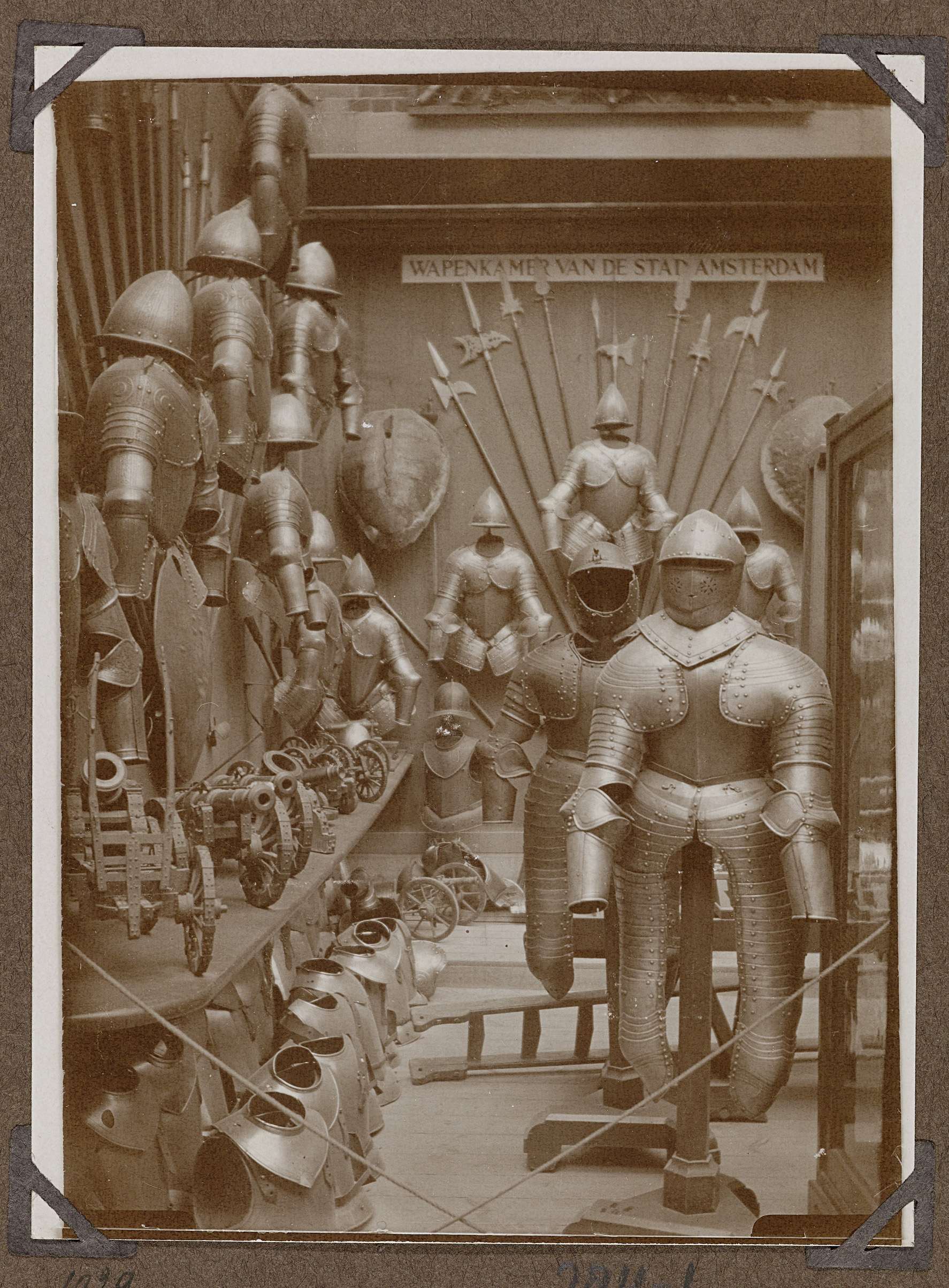 De oude wapenkamer van Amsterdam, waaronder enige modellen van kanonnen en een verzameling 16e eeuwse harnassen van de Amsterdamse schutterij. Oostelijke binnenplaats, voor de verbouwing van 1931-1933. De voornaamste ingreep was de aanleg van een depotkelder, waarvoor het vloerpijl met ongeveer een meter moest worden verlaagd. Hoek van een van de zalen. Deze zalen waren ...