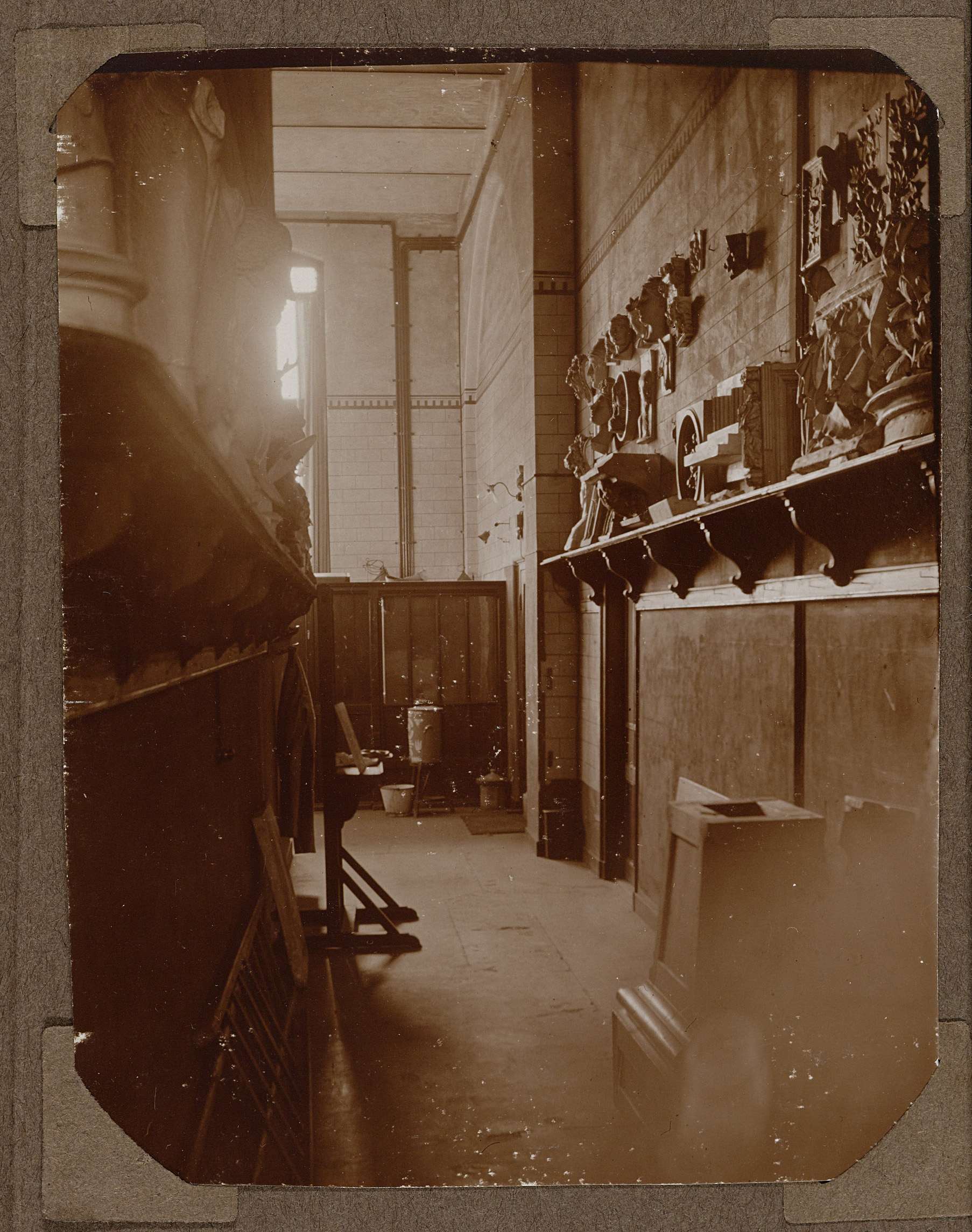 Gang (Rijksnormaalschool?), met rechts een plank waarop gipsmodellen te zien zijn. Troggewelf. Wand naast venster met tegelbeschildering, in het midden sierlijst, om de hoek doorlopend over blind venster (doorgang) en wand. Lambrizering aan vensterzijde.