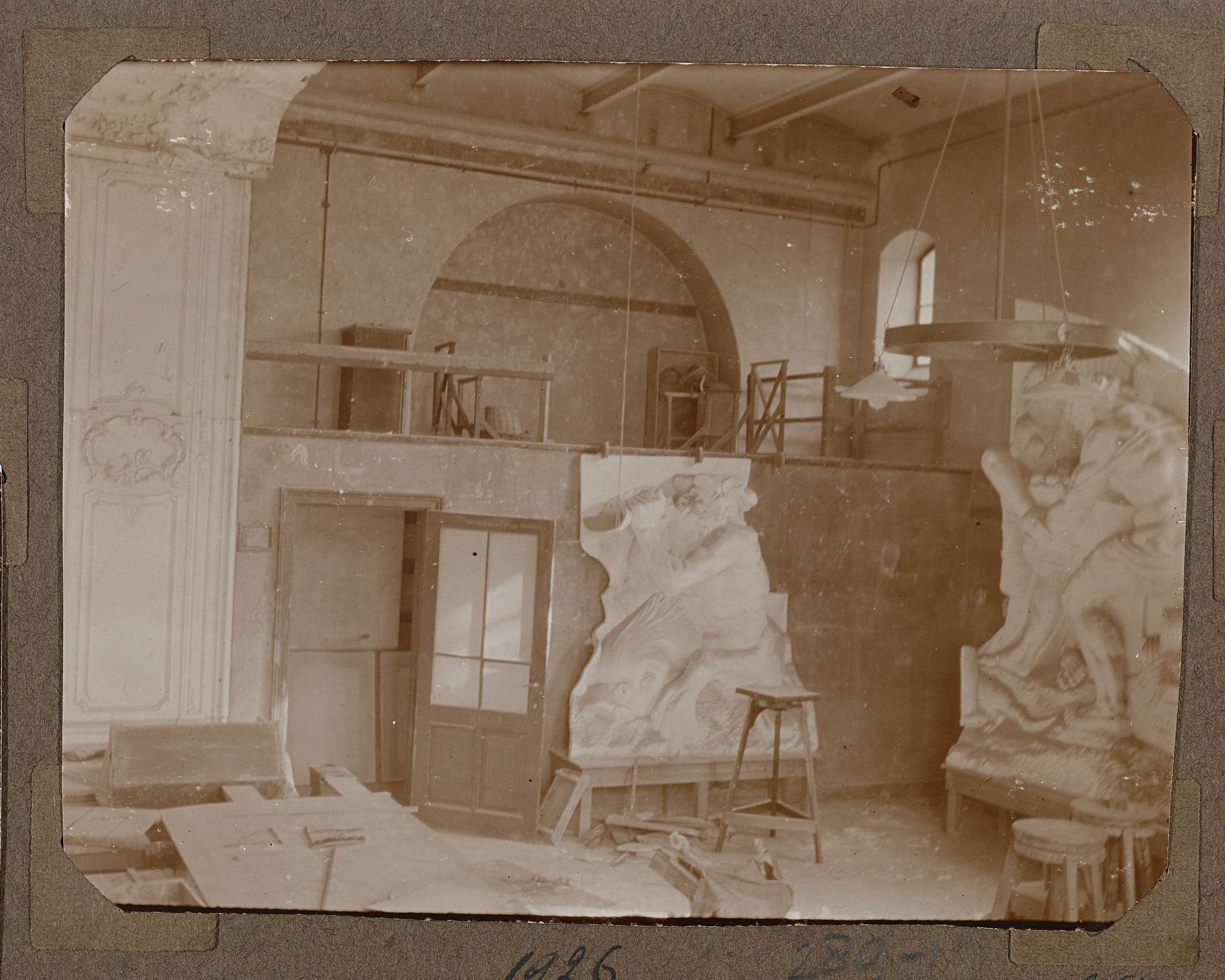 Gipsafgietsels in de werkruimte van toren 1? Gezien de lamp zou dit de Rijksnormaalschool kunnen zijn. (zie: Honderd jaar Rijksmuseum, p. 61)