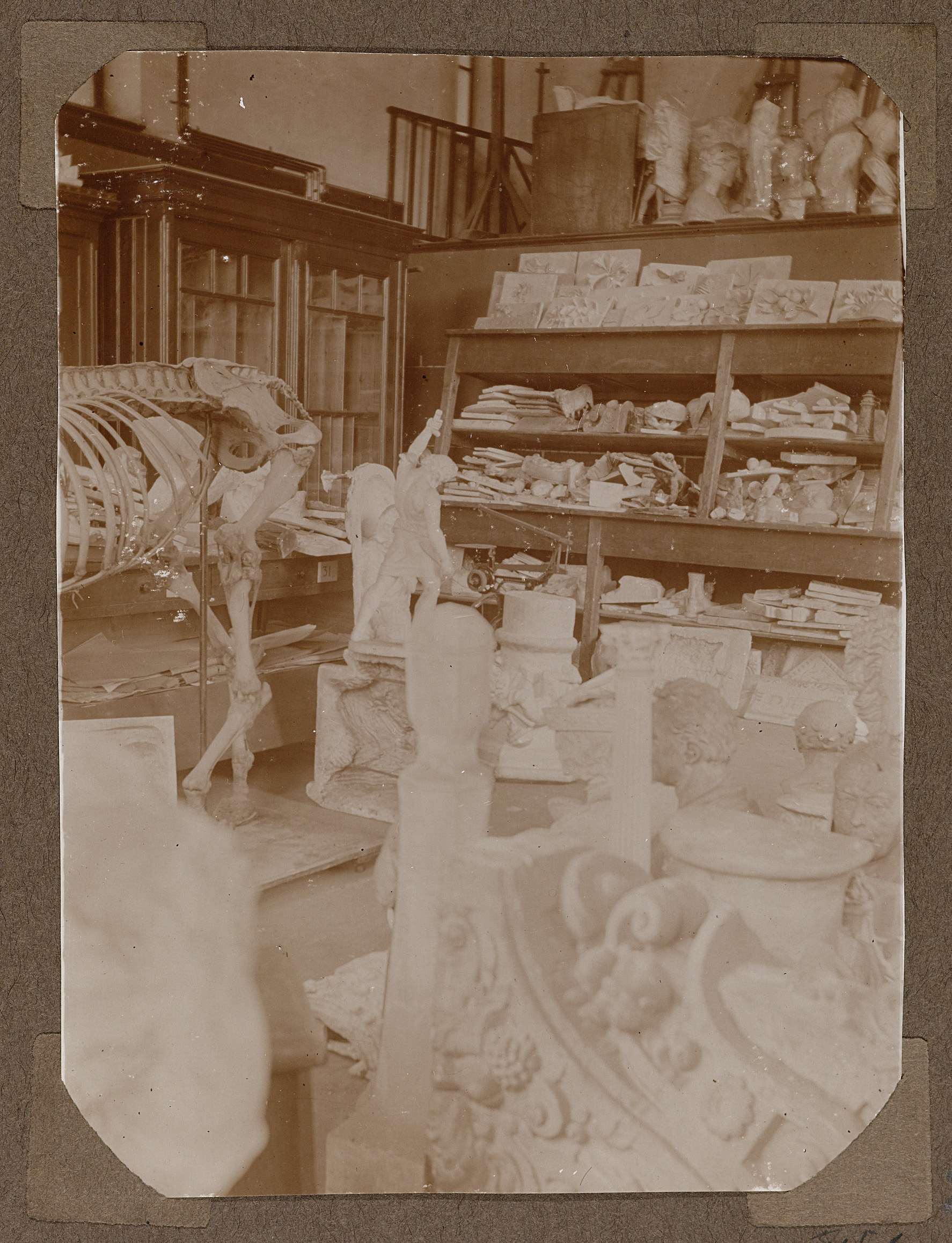 Een ruimte waar vele verschillende soorten en maten gipsmodellen zijn opgestapeld. In het midden links op de foto is een deel van een geraamte van een paard te zien. Hoogst waarschijnlijk behoort deze ruimte bij de voormalige Rijksnormaalschool die gevestigd was in toren 1.