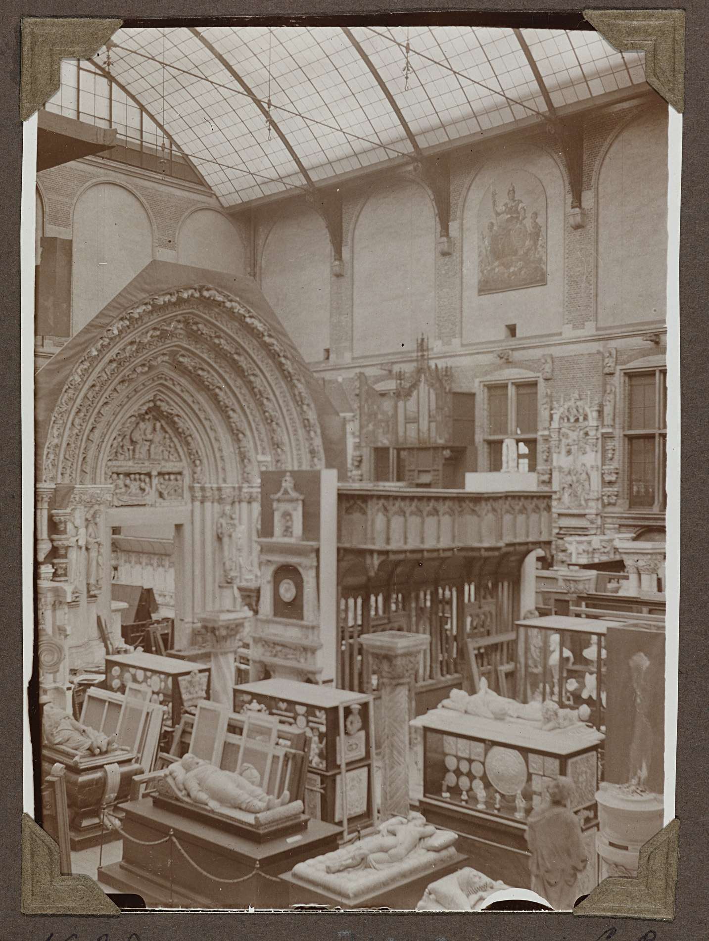 De Westelijke binnenplaats bevat reproductien van oud Nederlandse bouw- en beeldhouwwerken. Links op de foto een afgietsel van het zuidelijk portaal van de St. Servaaskerk te Maastricht waarnaast een eikenhouten koorbank is geplaatst. Op de voorgrond zijn o.a. verschillende praalgraven te zien. Westelijke binnenplaats noordwesthoek voor de verbouwing waarbij de verzwakte houten vloer werd vervangen ...