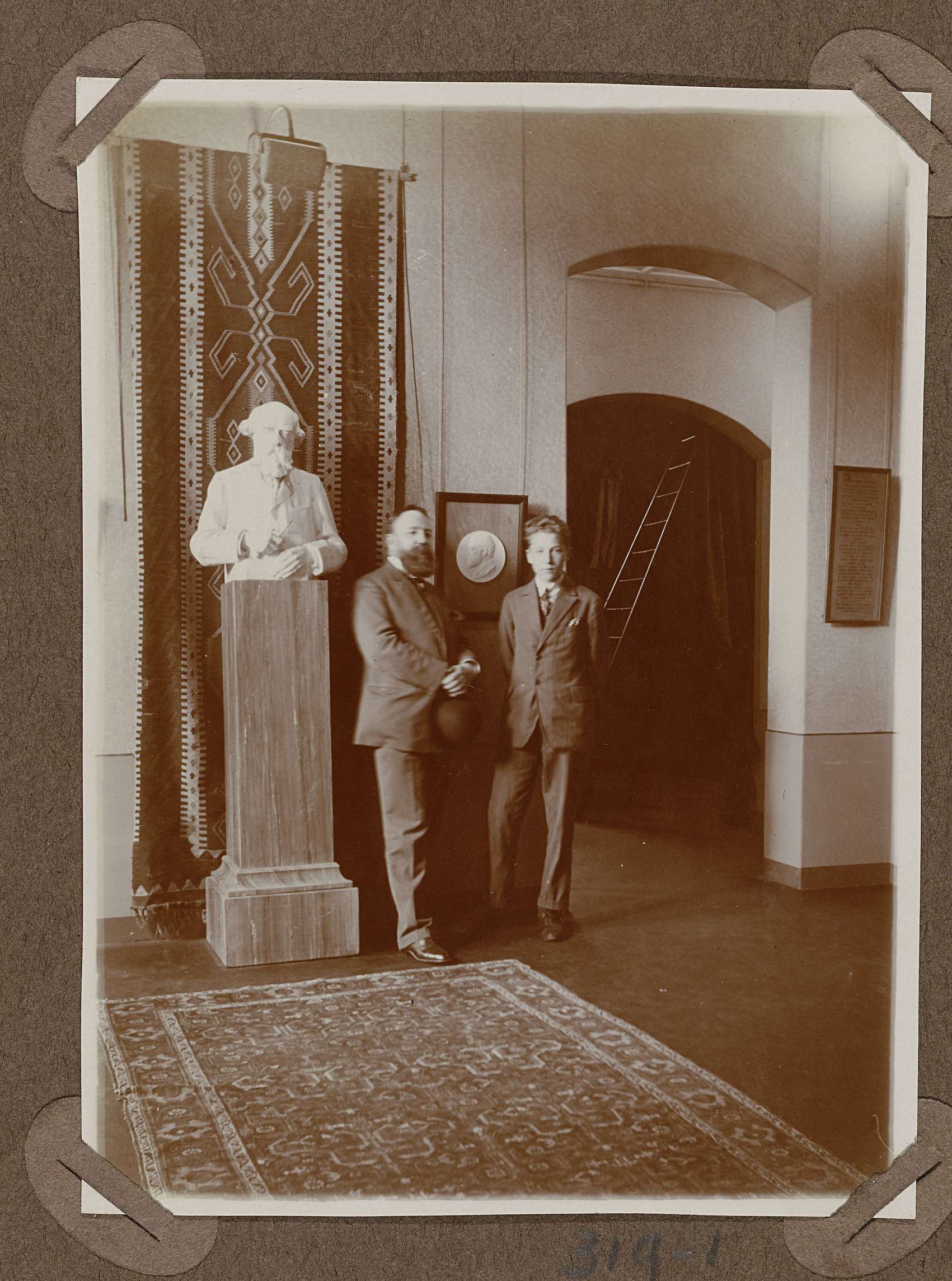 Twee heren poseren naast het borstbeeld van P.J.H. Cuypers in 1927
