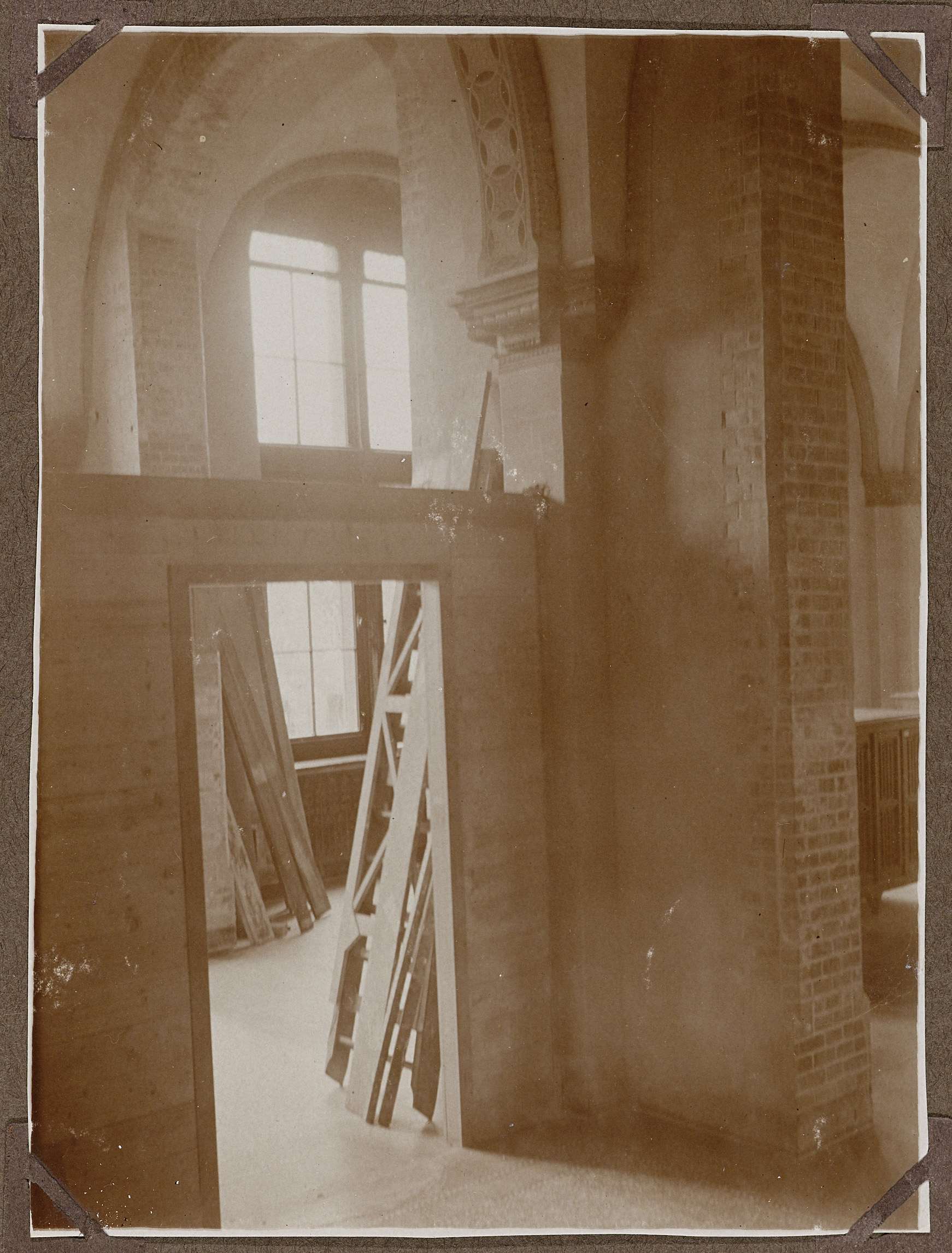 Verbouwing zaal?, plaatsing tussenwand, gedecoreerde sier?boog rustend op console. Kruisvenster. Misschien ook onderdeel verbouwing Nederlandsch museum, zie 329