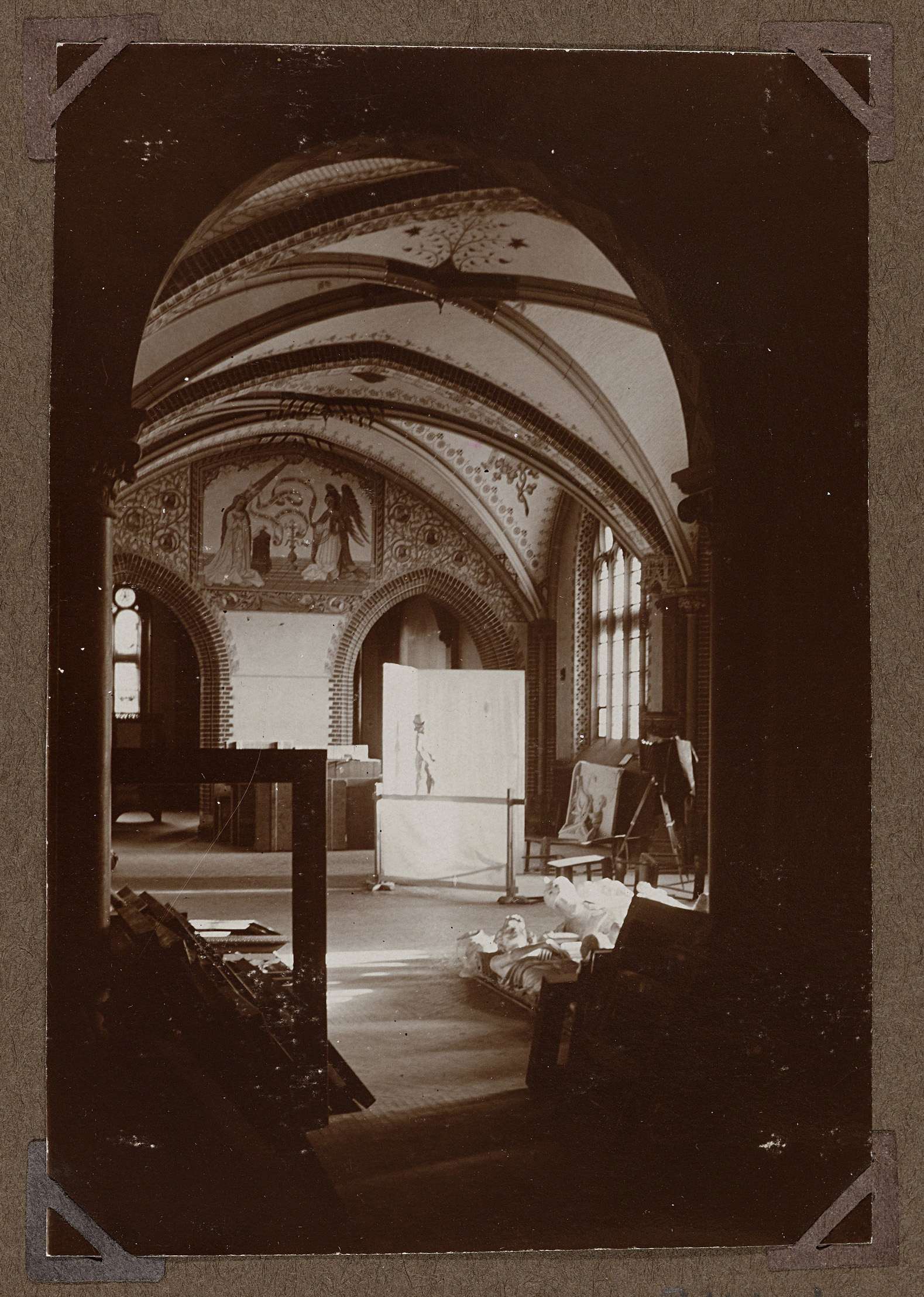 Zalen 173-171 gezien naar het oosten. Deze zalen maakten deel uit van het Nederlandsch museum. Zij waren gewijd aan 15de eeuwse kerkelijke bouwkunst met architectuur en beschildering uit deze tijd. De architectuur is gekopieerd naar die van de St. Michaëlkerk te Zwolle, de beschilderingen zijj onder andere ontleend aan de oude kerk te Amsterdam. Op ...