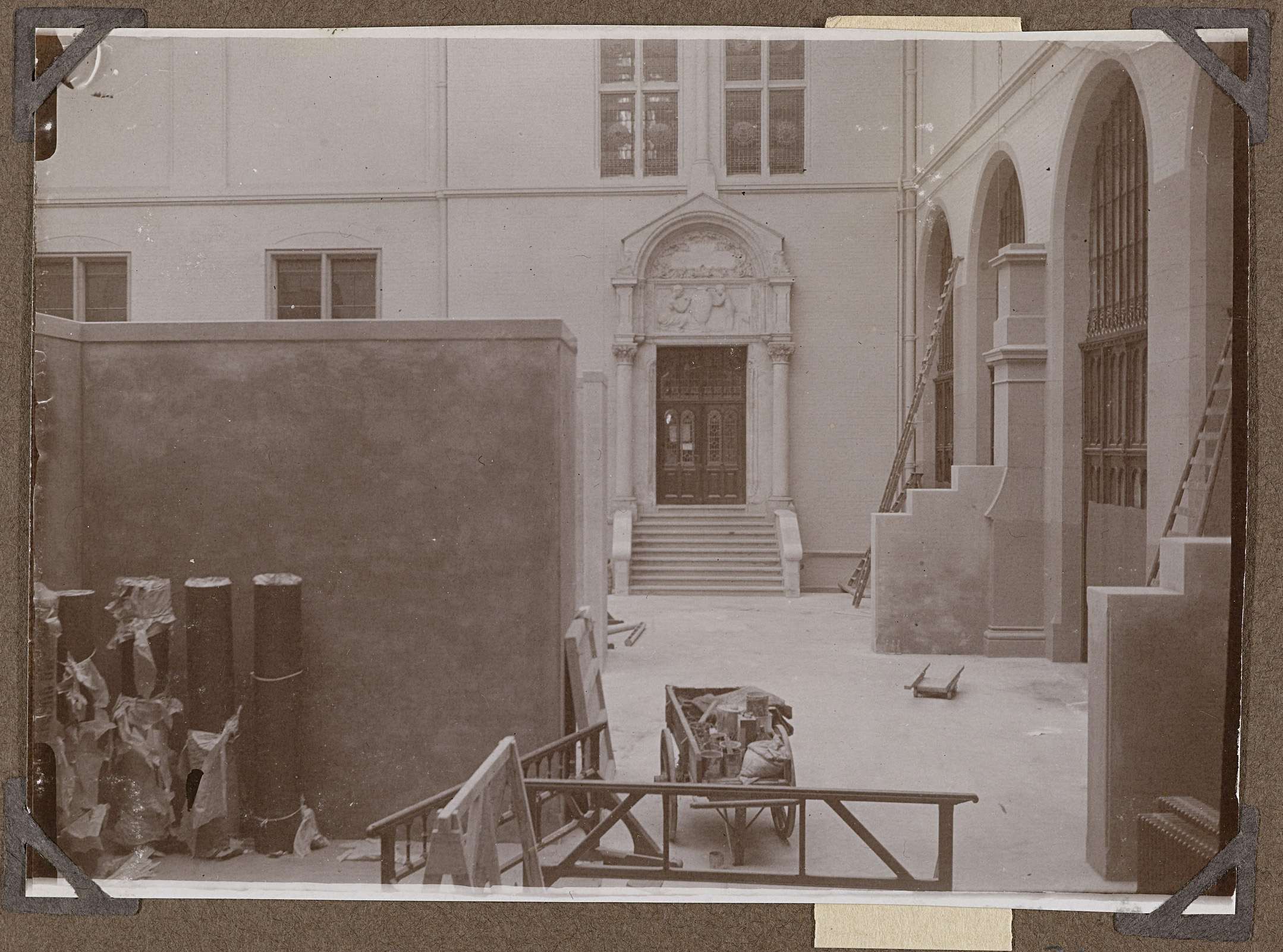 Westelijke binnenplaats gefotografeerd naar het noorden, te zien is noordwand met de toegang vanuit toren III naar de binnenplaats, foto genomen tijdens verbouwing waarbij verhoogde betonvloer werd aangelegd. De wanden zijn witgeverfd. Rechts de oostwand met grote vensters naar de onderdoorrit. De decoratie boven de ingang is, enigszins geschonden,thans (1998) nog terug te vinden in ...