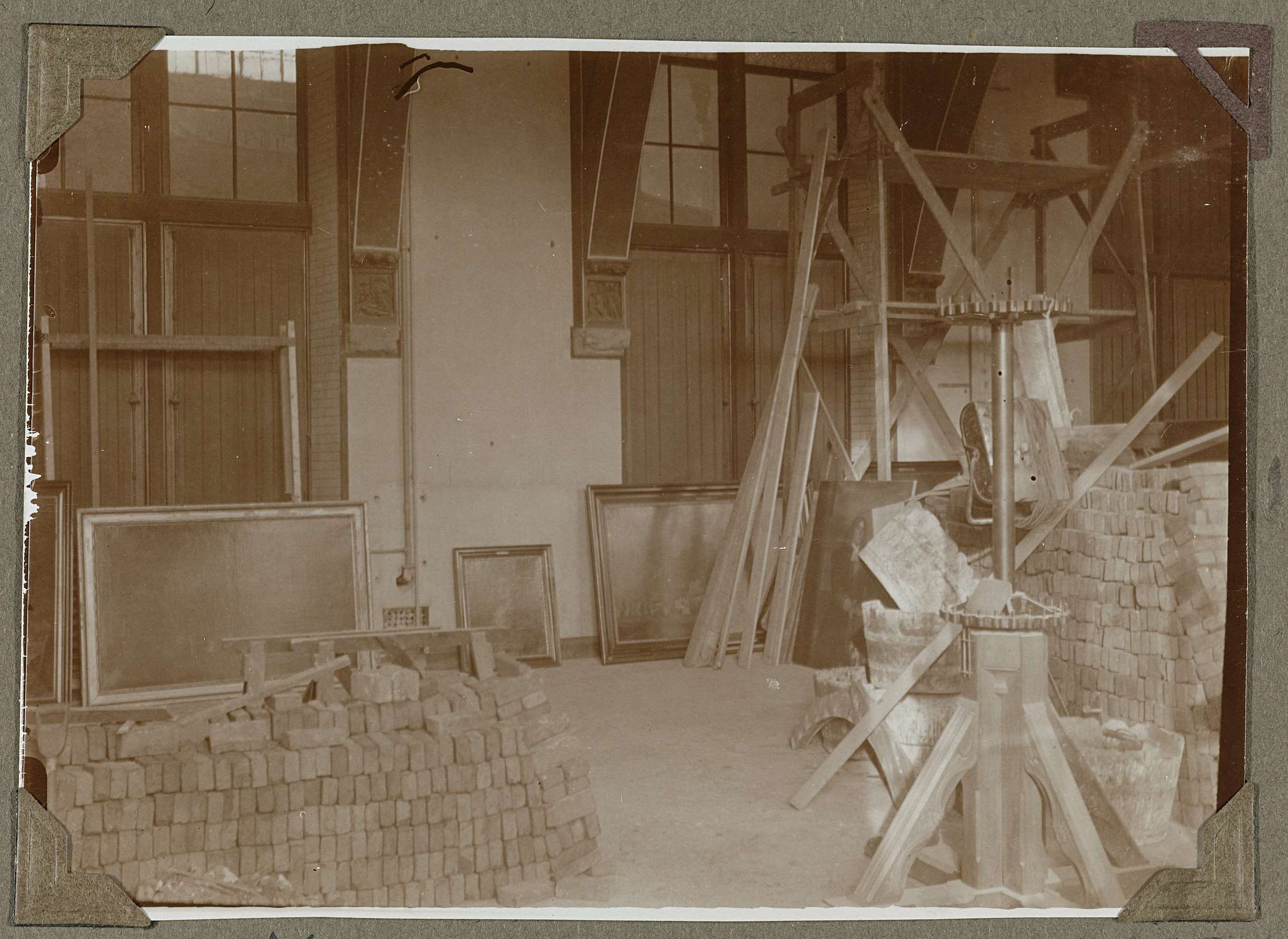 Zaal gezien naar het noordwesten, de westwand. De zaal wordt verbouwd; er staan bakstenen opgestapeld, steigers e.d.. Tussen deze bouwmaterialen staan de schilderijen op de grond. Boven een deel van een kopie van de zoldering van het stadhuis van Sluis, die in het jaar waarin deze foto is genomen, is verwijderd. Door de vensters is ...