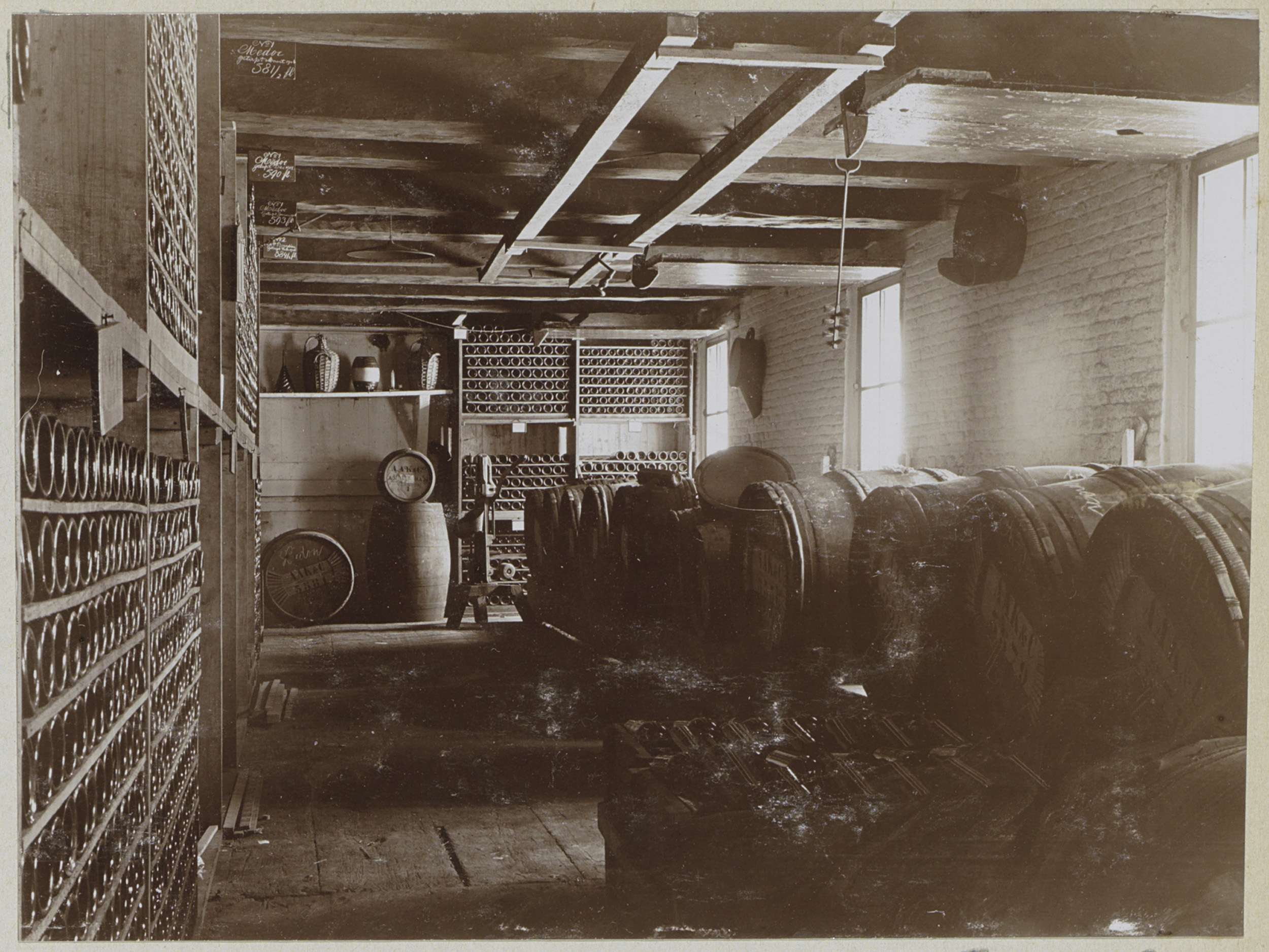 Interieur van een brouwerij: houten vaten en flessen op rekken