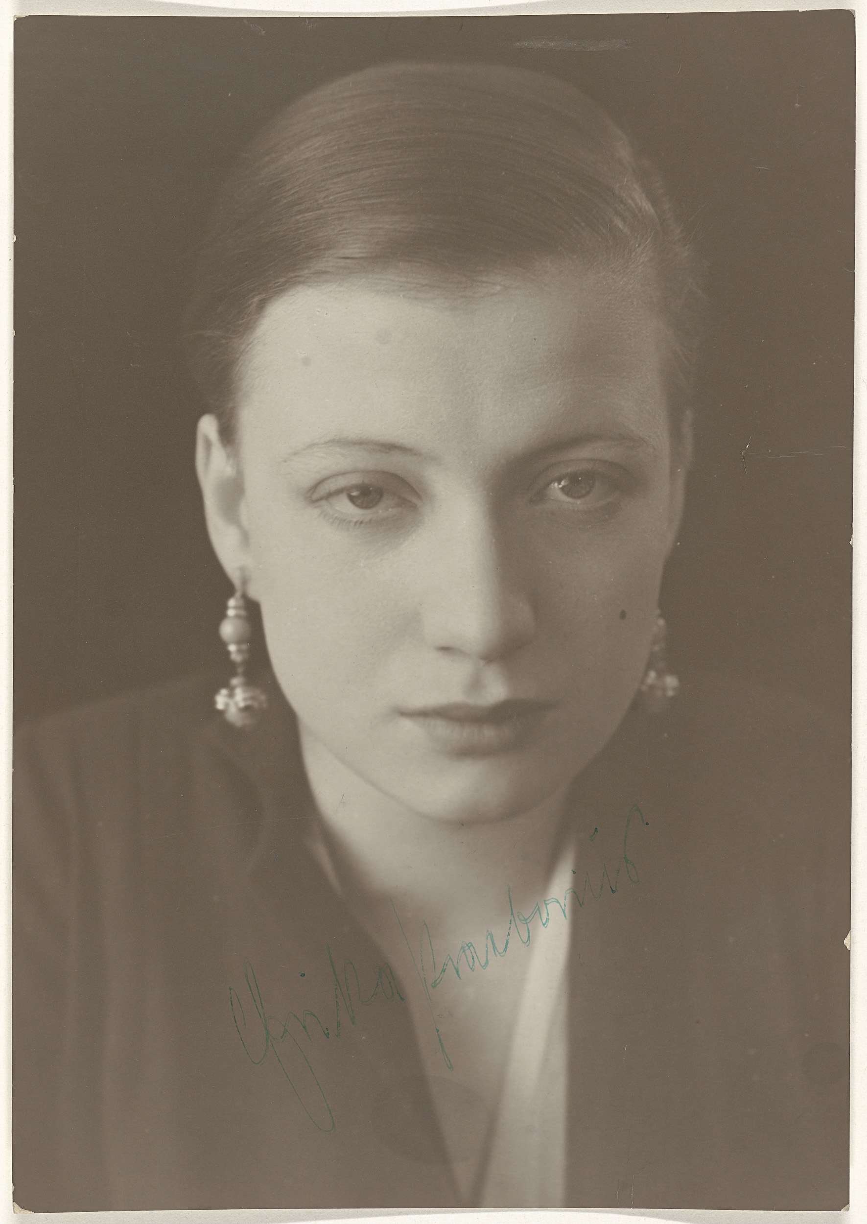 Portret van een actrice met grote oorbellen, gesigneerd Frika Prazbovint[onz]