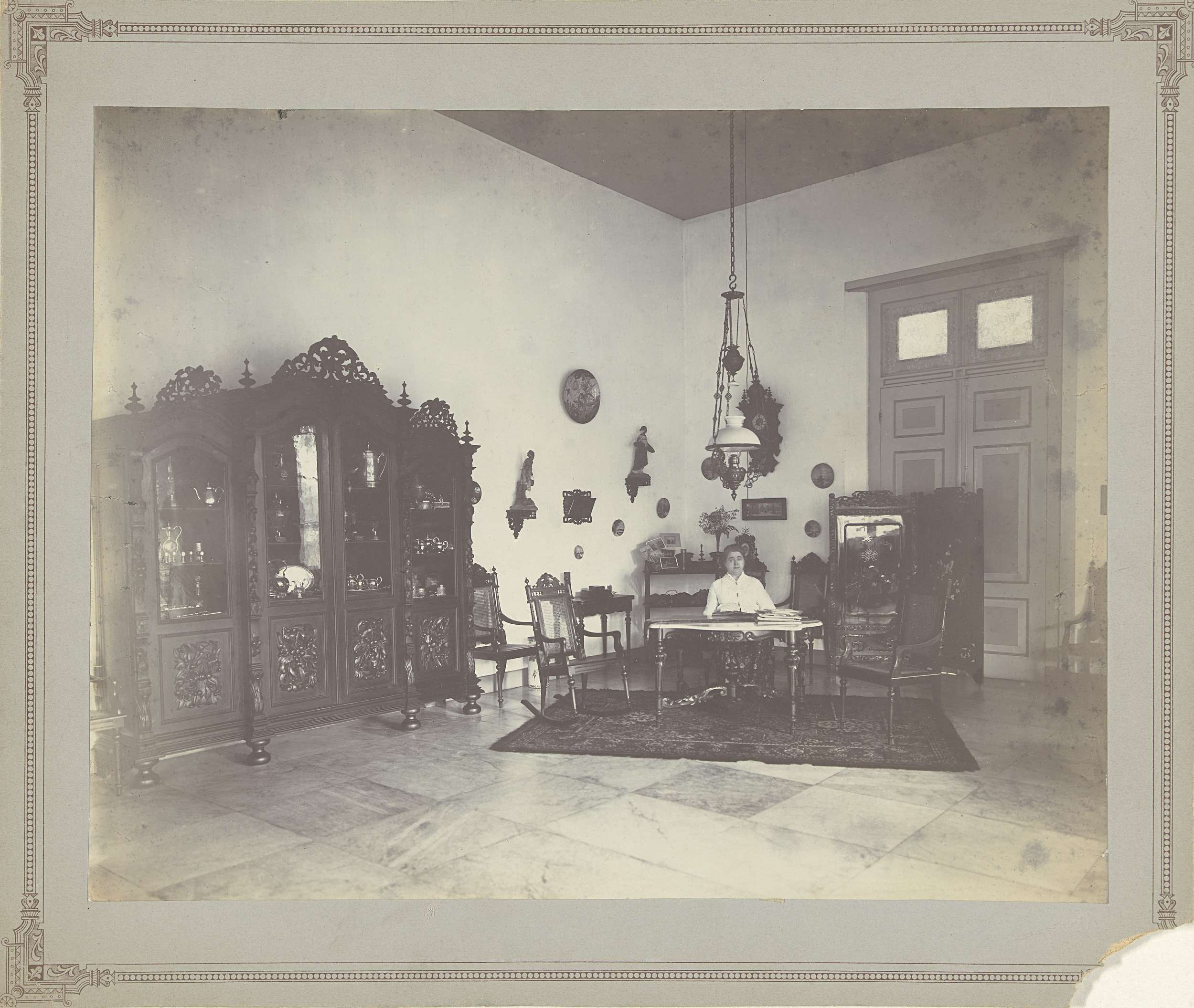 Huiskamer met koloniaal interieur met een onbekende vrouw, Nederlands-Indië