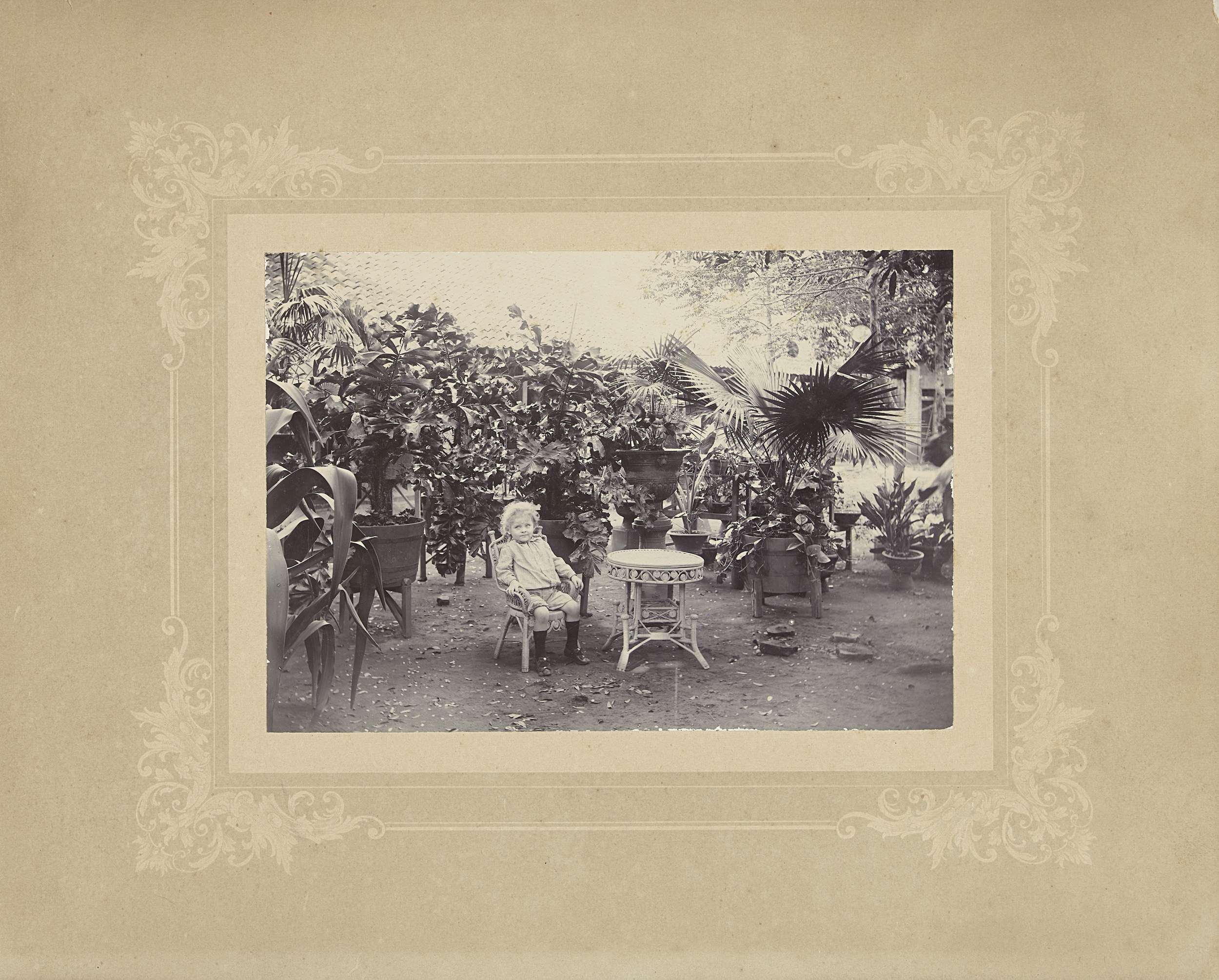 Portret van een onbekend kind op een stoel tussen planten in Nederlands-Indië