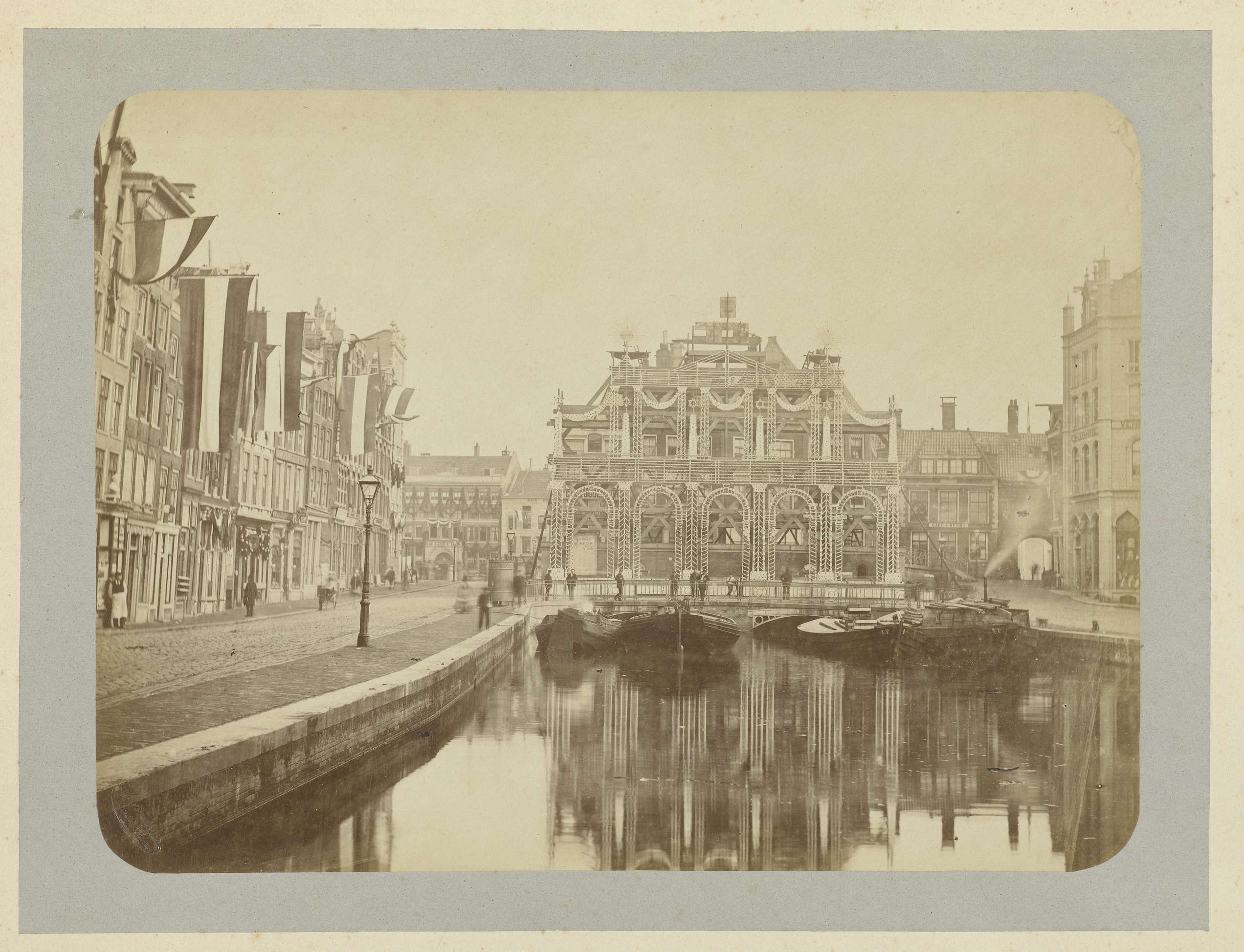 Decoratie bij de ontvangst van Willem III en Emma op het Rokin in Amsterdam