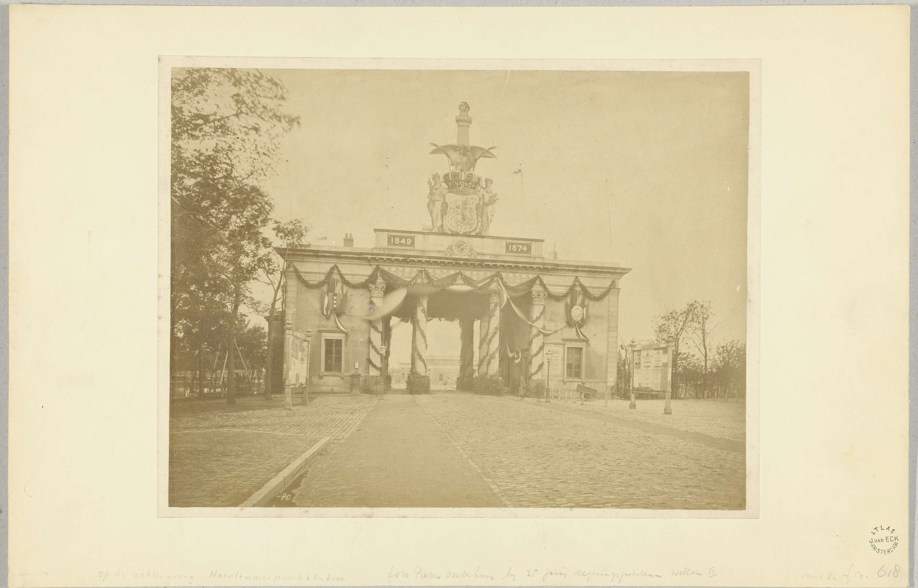 Versierde Willemspoort bij gelegenheid van het 25-jarig regeringsjubileum van koning Willem III, Amsterdam