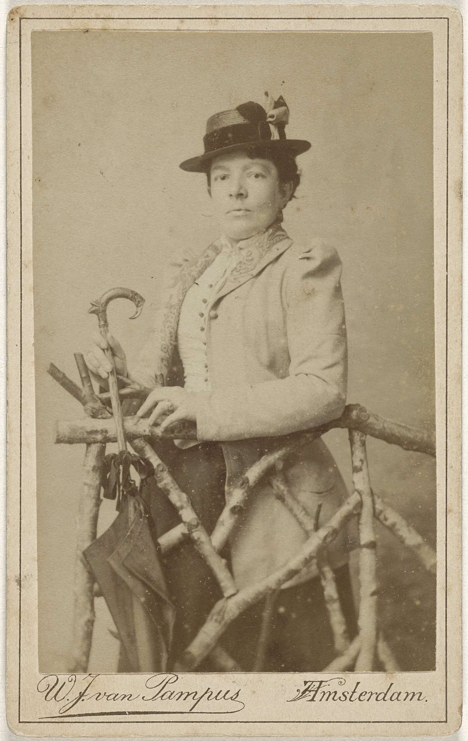 Studioportret van dame met paraplue achter houten hekje
