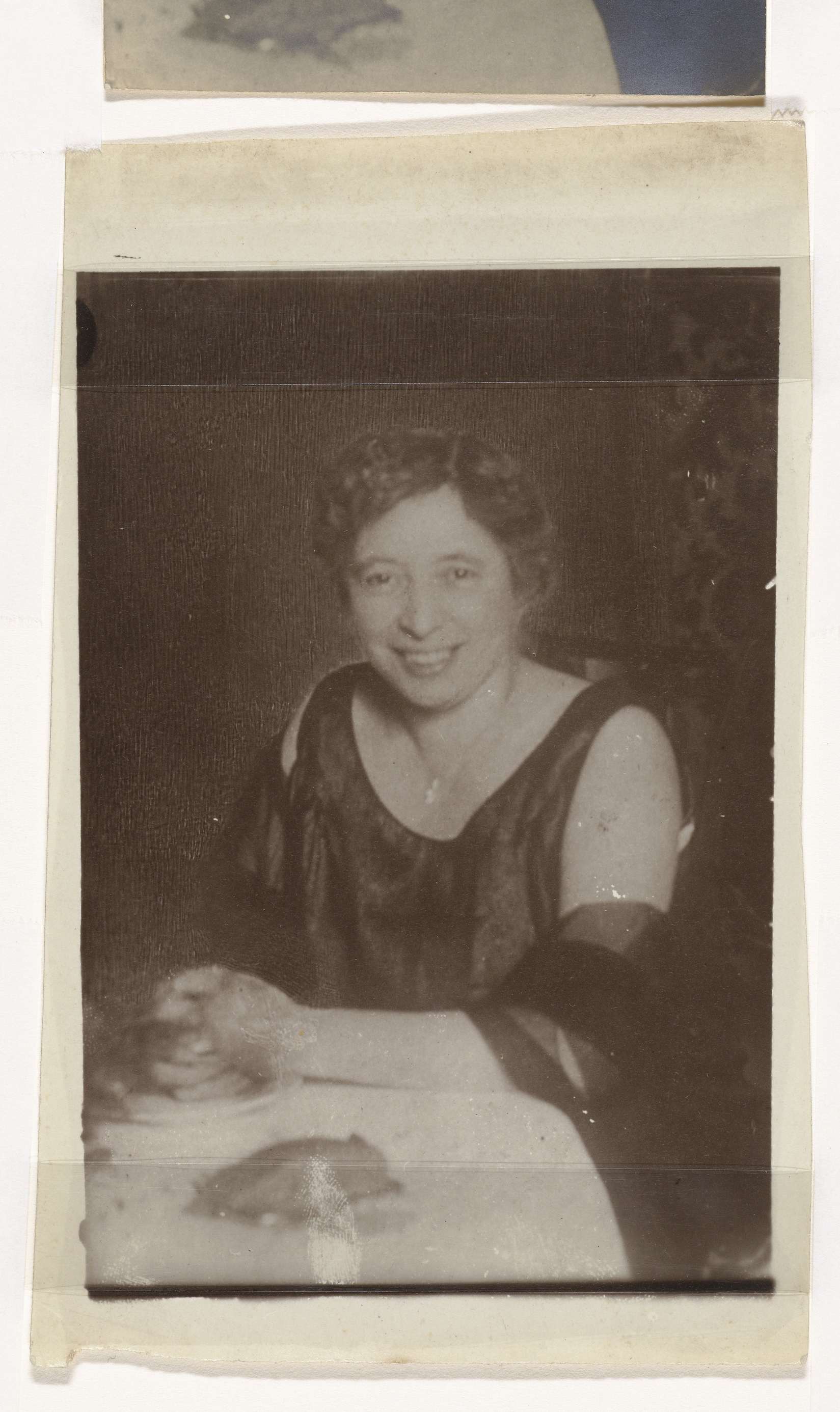 Portret van een oudere vrouw aan tafel in gala jurk