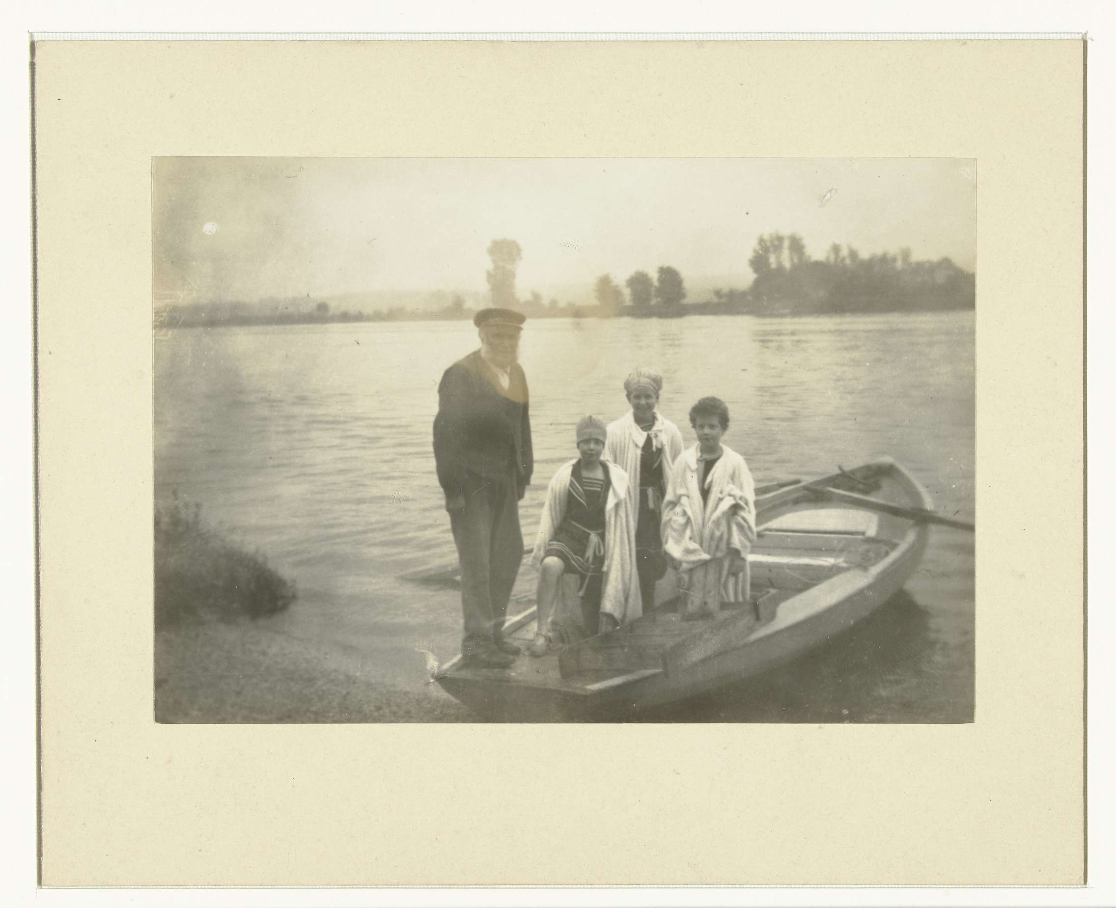Groepsportret van drie onbekende kinderen in badkleding met een oude man in een roeiboot
