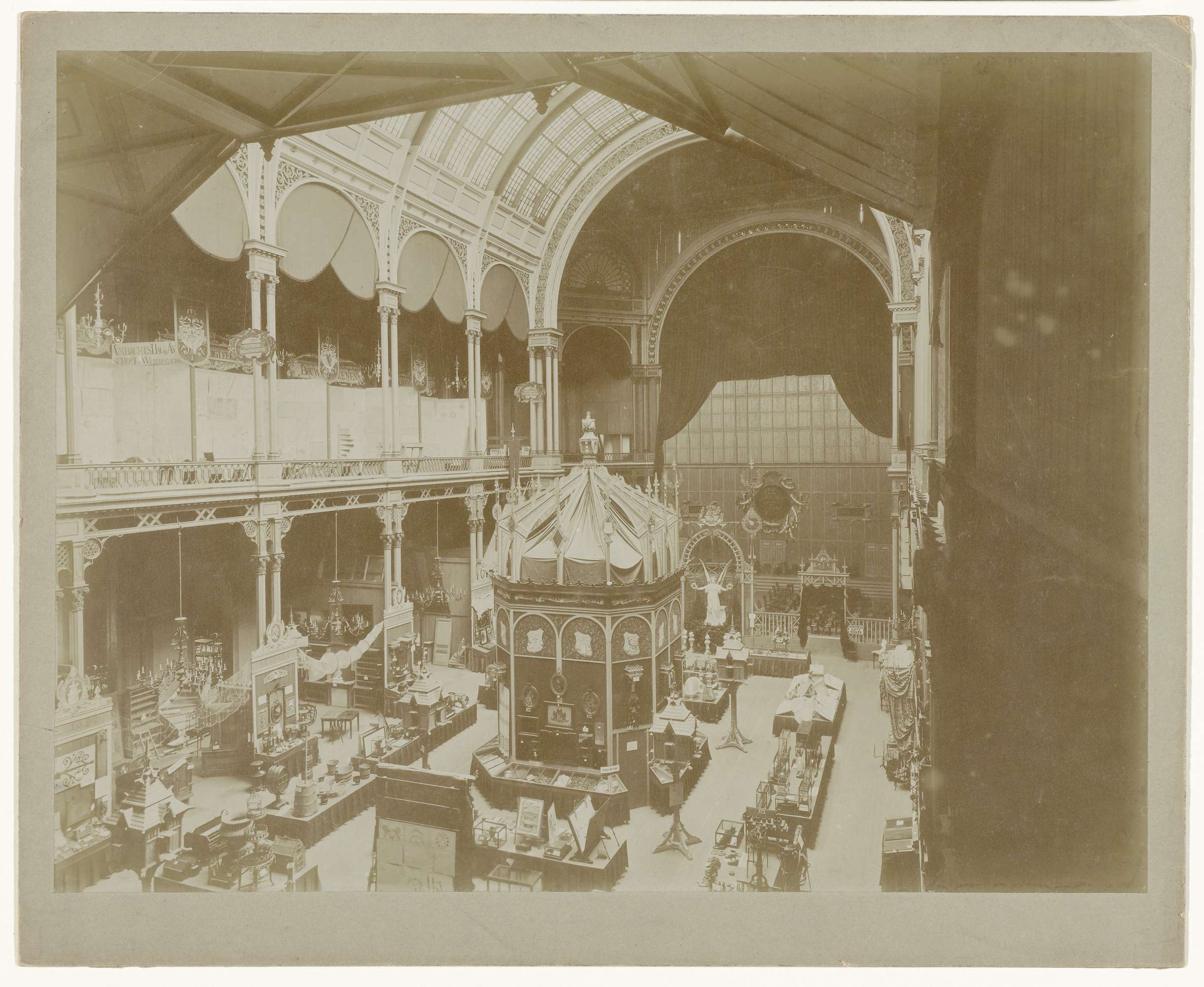 Interieur van het Paleis voor Volksvlijt, Amsterdam, tijdens een nijverheidstentoonstelling of westrijd(?) in 1892