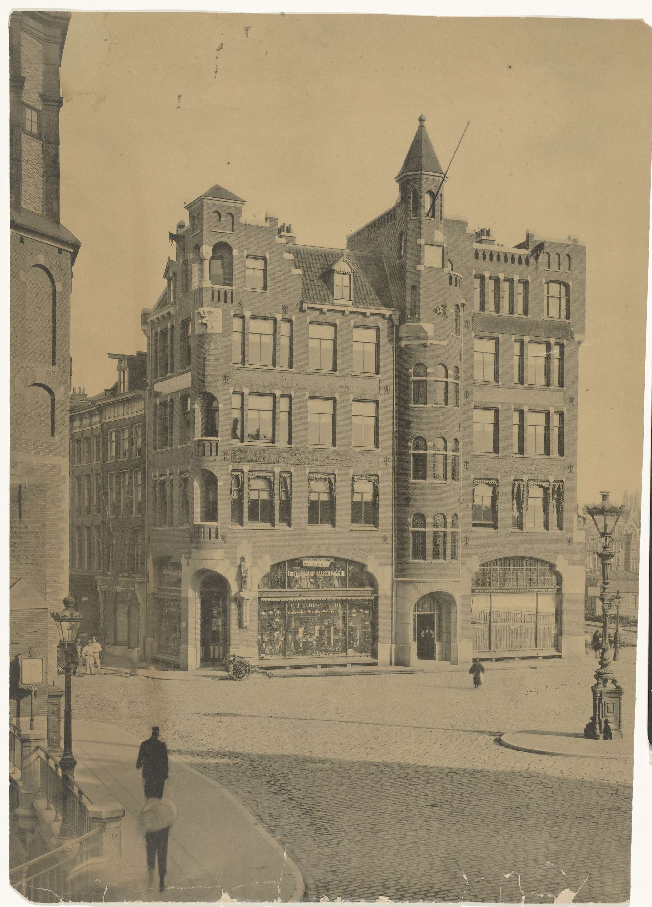Muntplein 2-4. Onderin het pand links is het Engelsch/Amerikaansch Magazijn van C.J. Schravendijk gevestigd. Links de Munttoren.