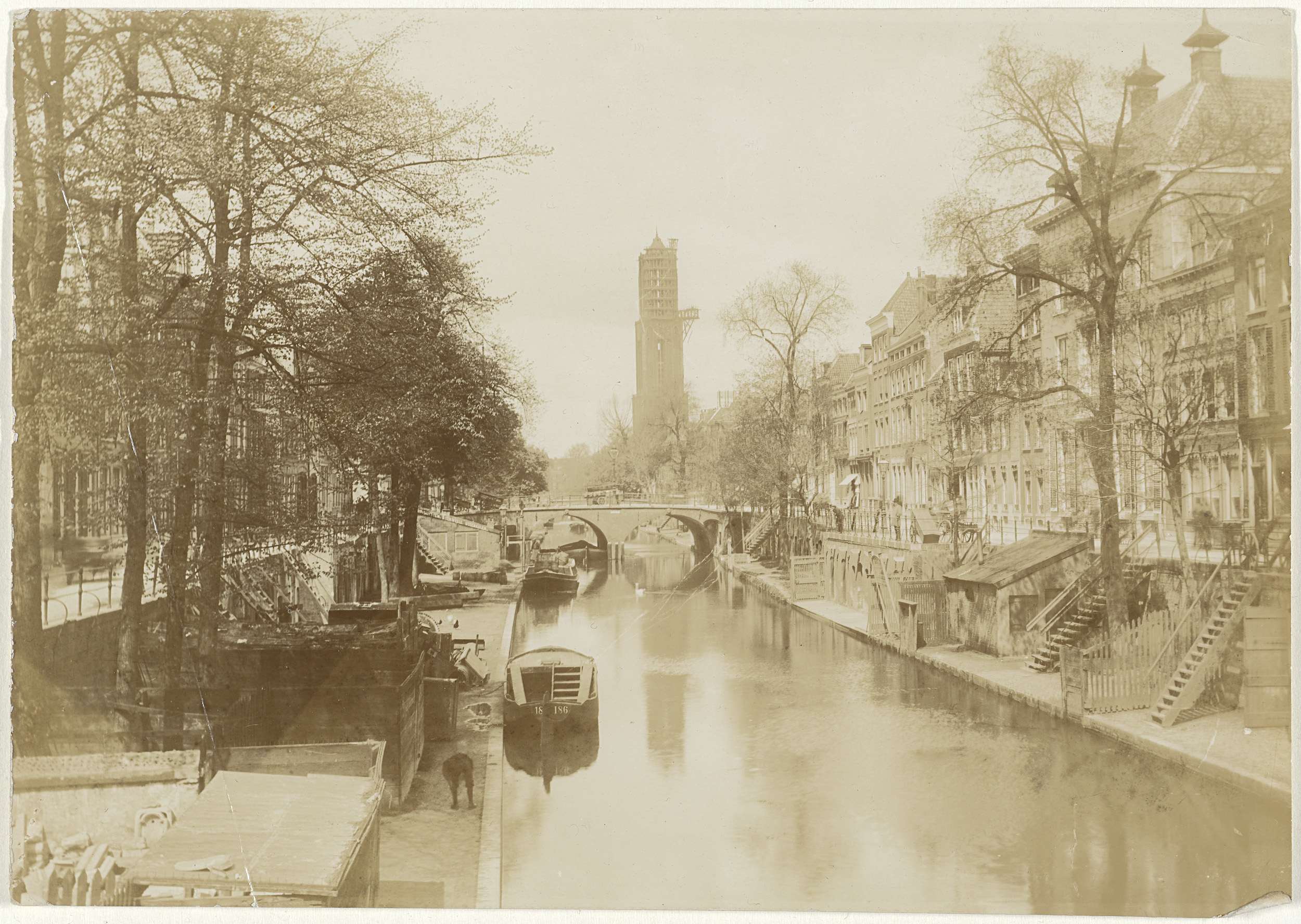Gezicht op de Oude Gracht in Utrecht, in de verte de Domtoren tijdens een verbouwing