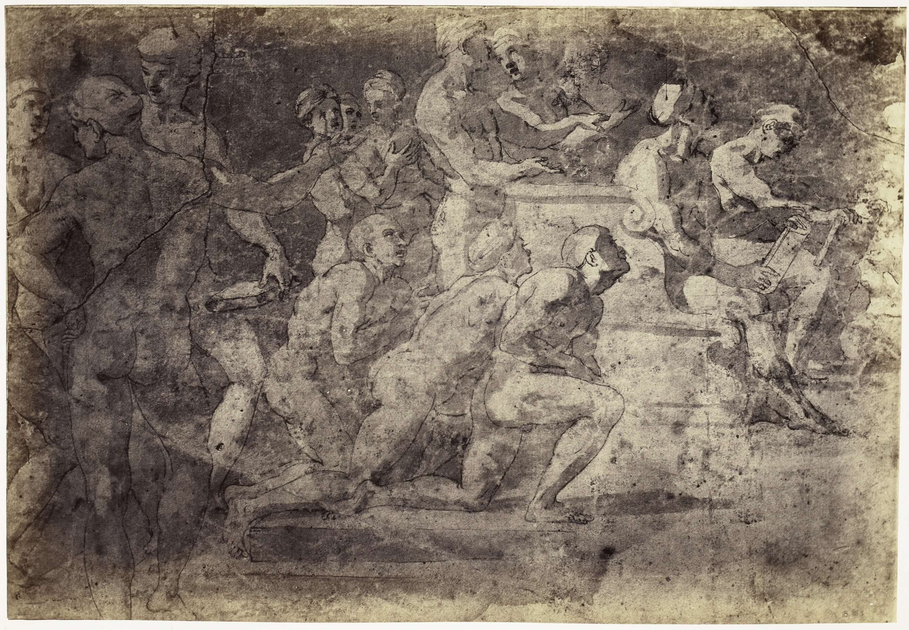 Fotoreproductie van een tekening van Rafaël, leerlingen tijdens college