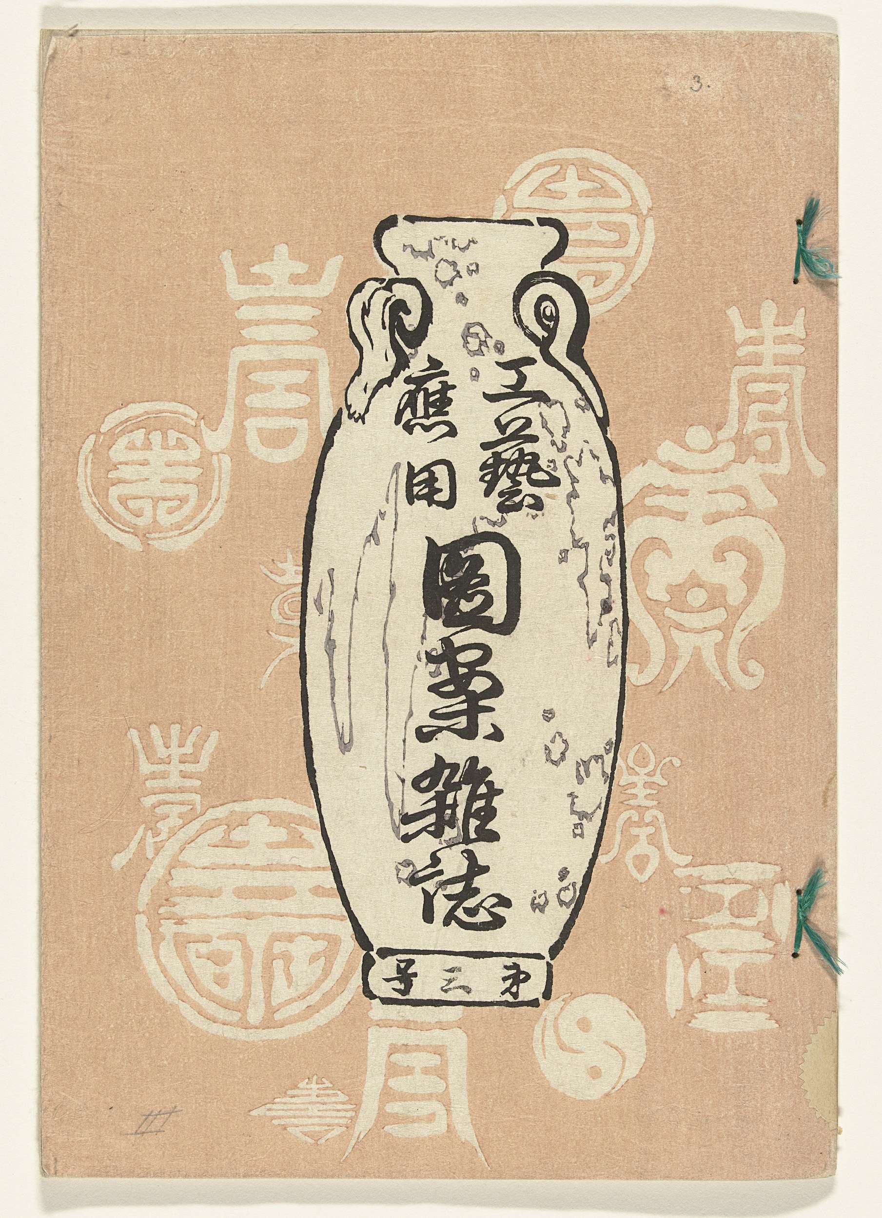 Deel drie; roze kaft met diverse emblemen en afbeelding van een vaas waarop titel; 11 bladen: drie pagina`s tekst; acht bladen, zwart-wit ontwerpen; laatste blad, colofon.
