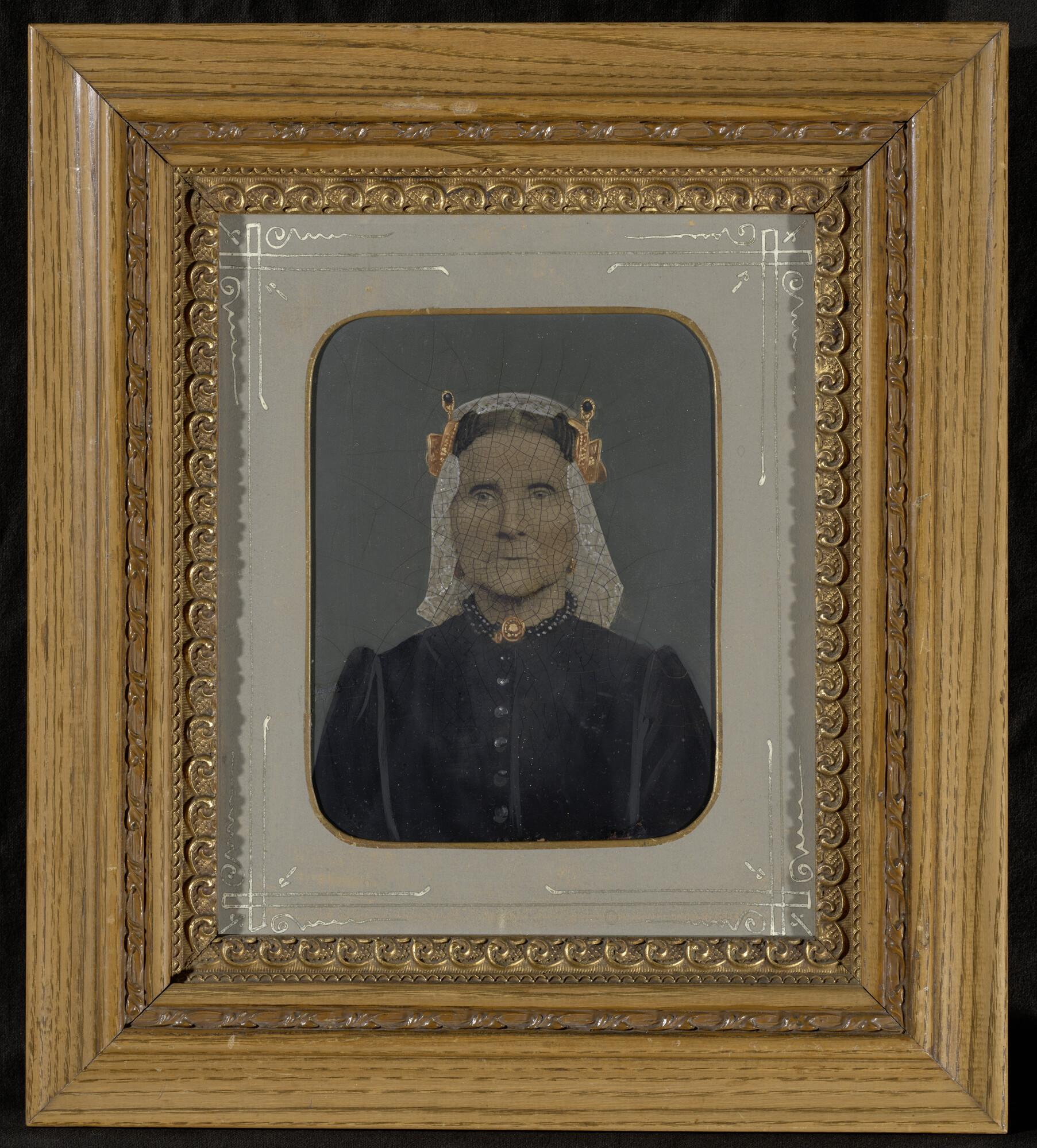 Portretfoto van Aaltje Pronker (1836-1903) in Terschellinger dracht. Ingekleurde ferrotypie, vervaardigd in opdracht van haar zoon Feije Spits (1875-1951) vermoedelijk in New York in april 1893, naar een bestaand fotoportret. In houten lijst.