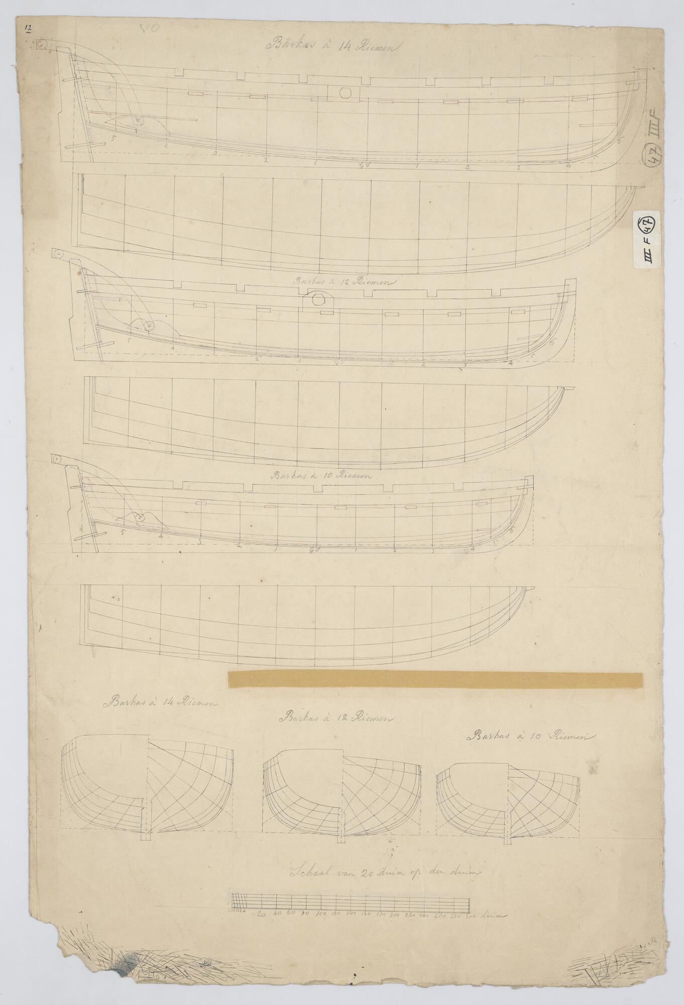 Lijnenplan van een reddingboot van veertien riemen, Barkas