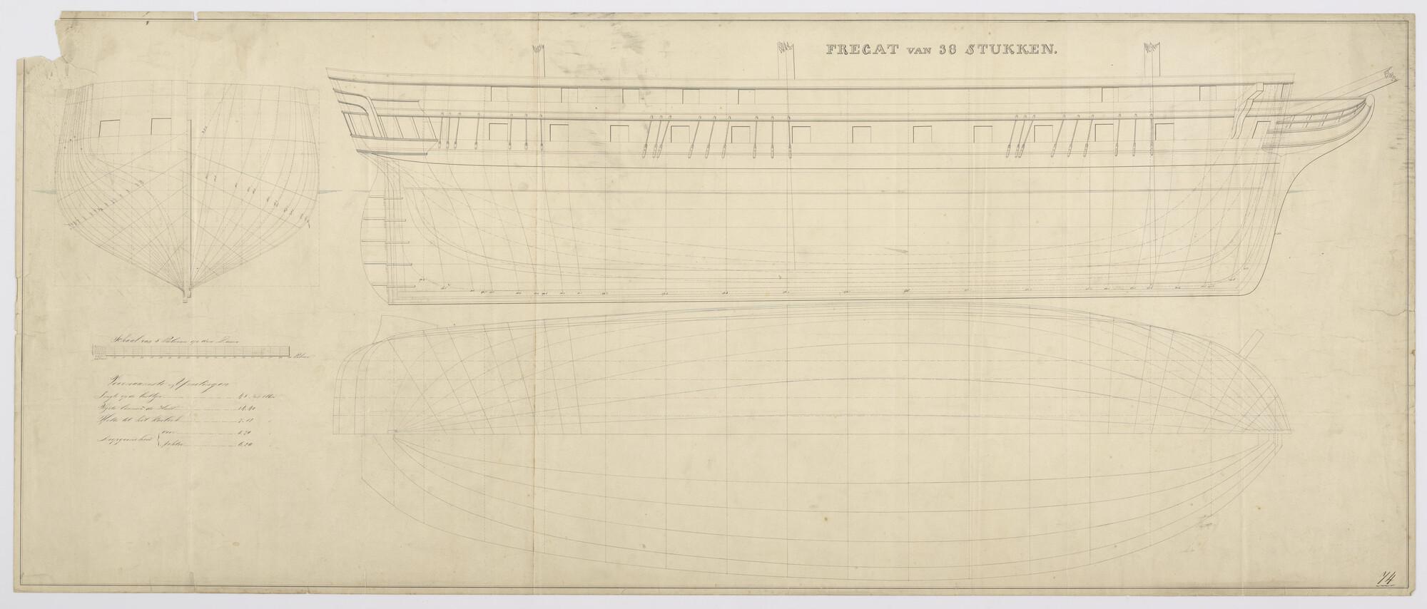 Lijnenplan, zijaanzicht, bovenaanzicht, spantenraam, senten en waterlijn en detailtekeningen van het roer van een fregat van 38 stukken.