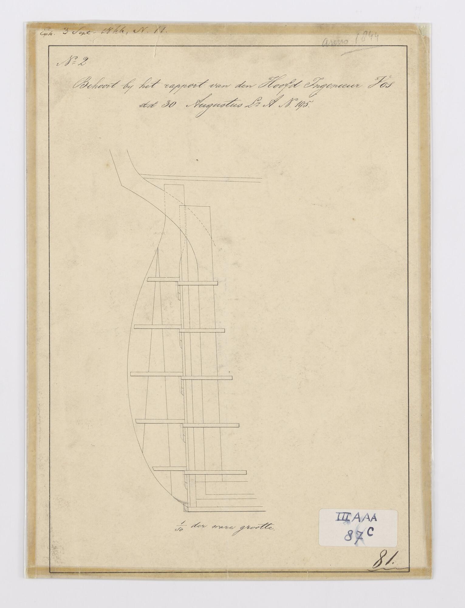 Lijnenplan, zijaanzicht, bovenaanzicht, spantenraam, senten en waterlijn en detailtekeningen van het roer van een fregat van 38 stukken.