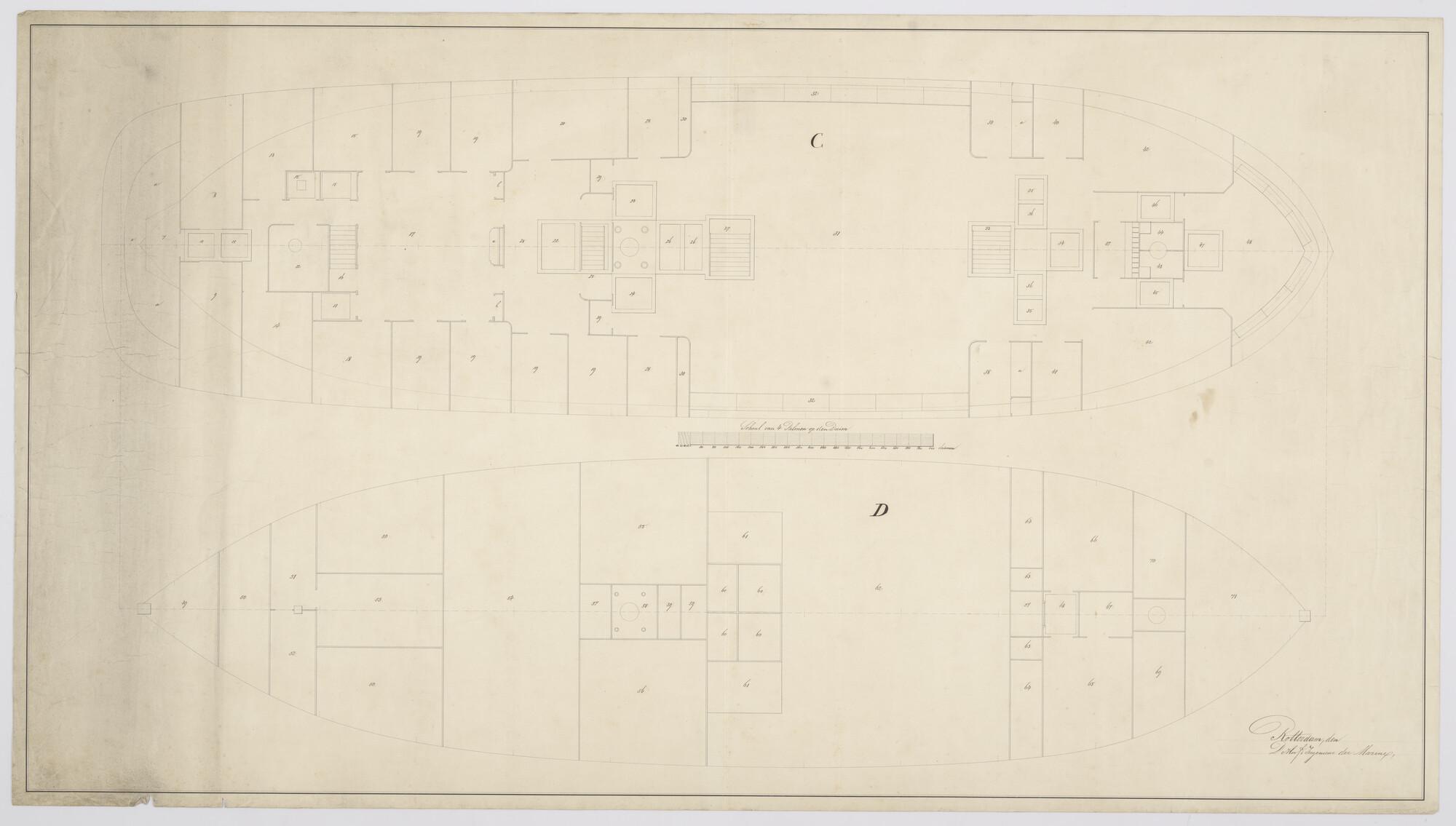 Tussendek en ruim met aanwijzing van de inwendige verdeling en maten rondhout