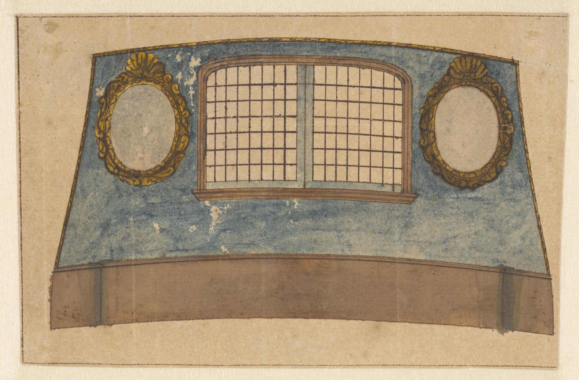 Spiegelversiering VOC schip van de kamer van Amsterdam, kajuitramen van een ander vaartuig.