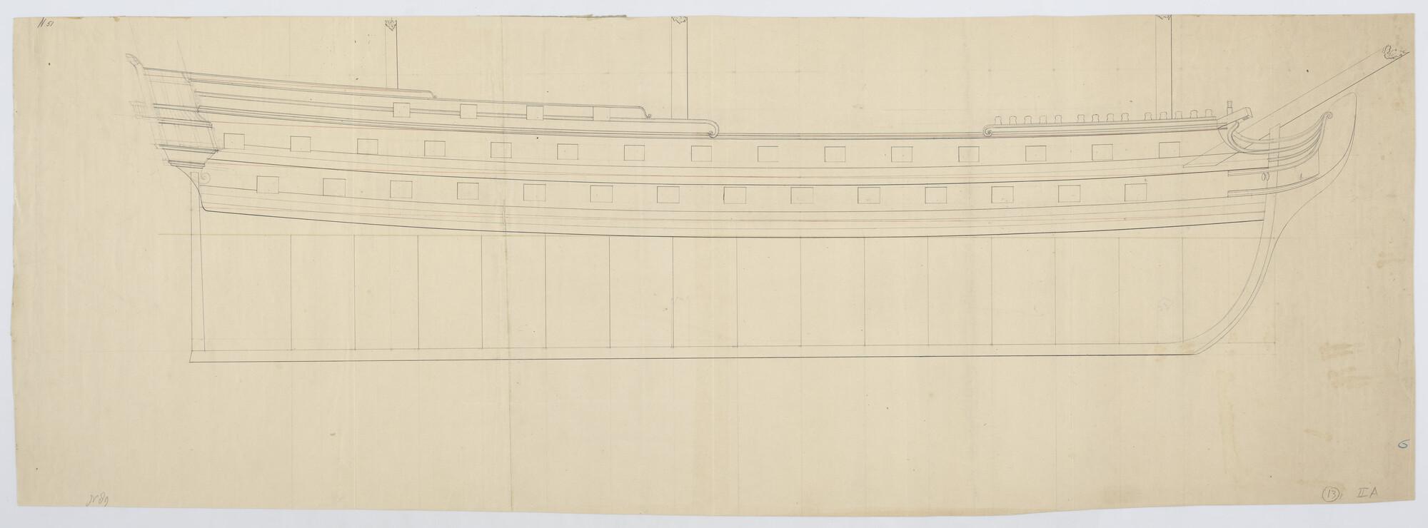 Lijnenplan van een schip van 70 stukken