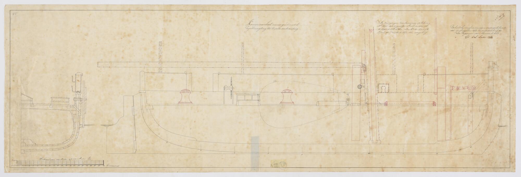 Bovenaanzicht, verticale langsdoorsnede, dwarsdoorsnede en grootspant van een gaffelkanonneerboot nieuw groot model. Ingericht tot torpedowerkvaartuig 1872.