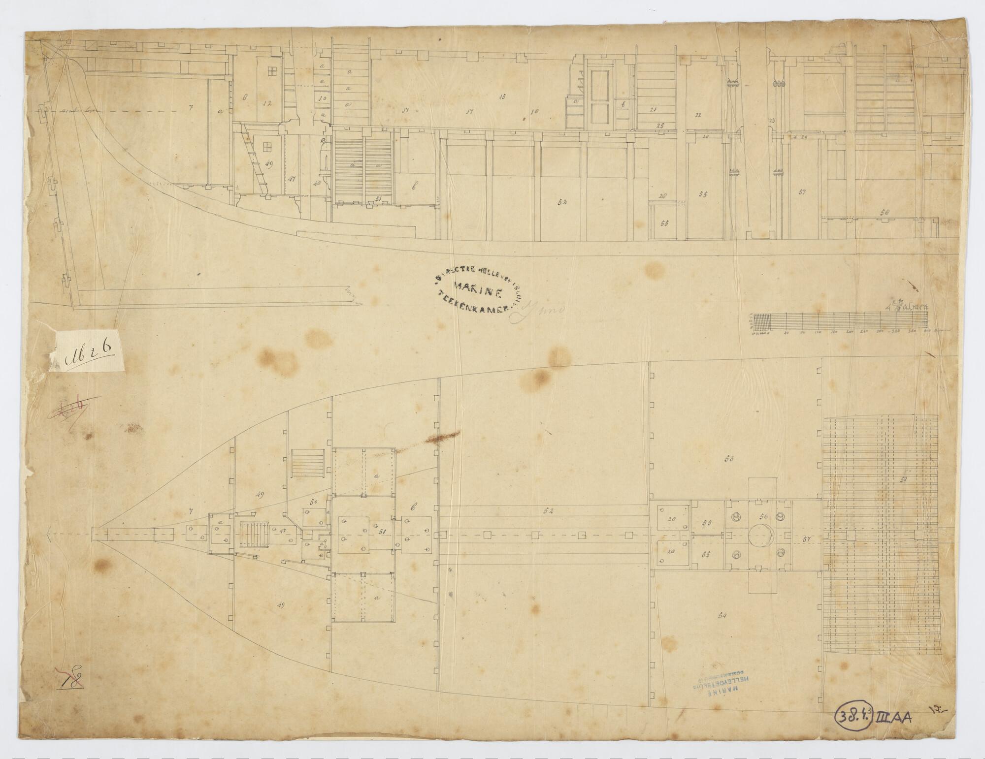 Verticale langsdoorsnede en bovenaanzicht ruim van het kuilkorvet Zr.Ms. Juno van 32 stukken.