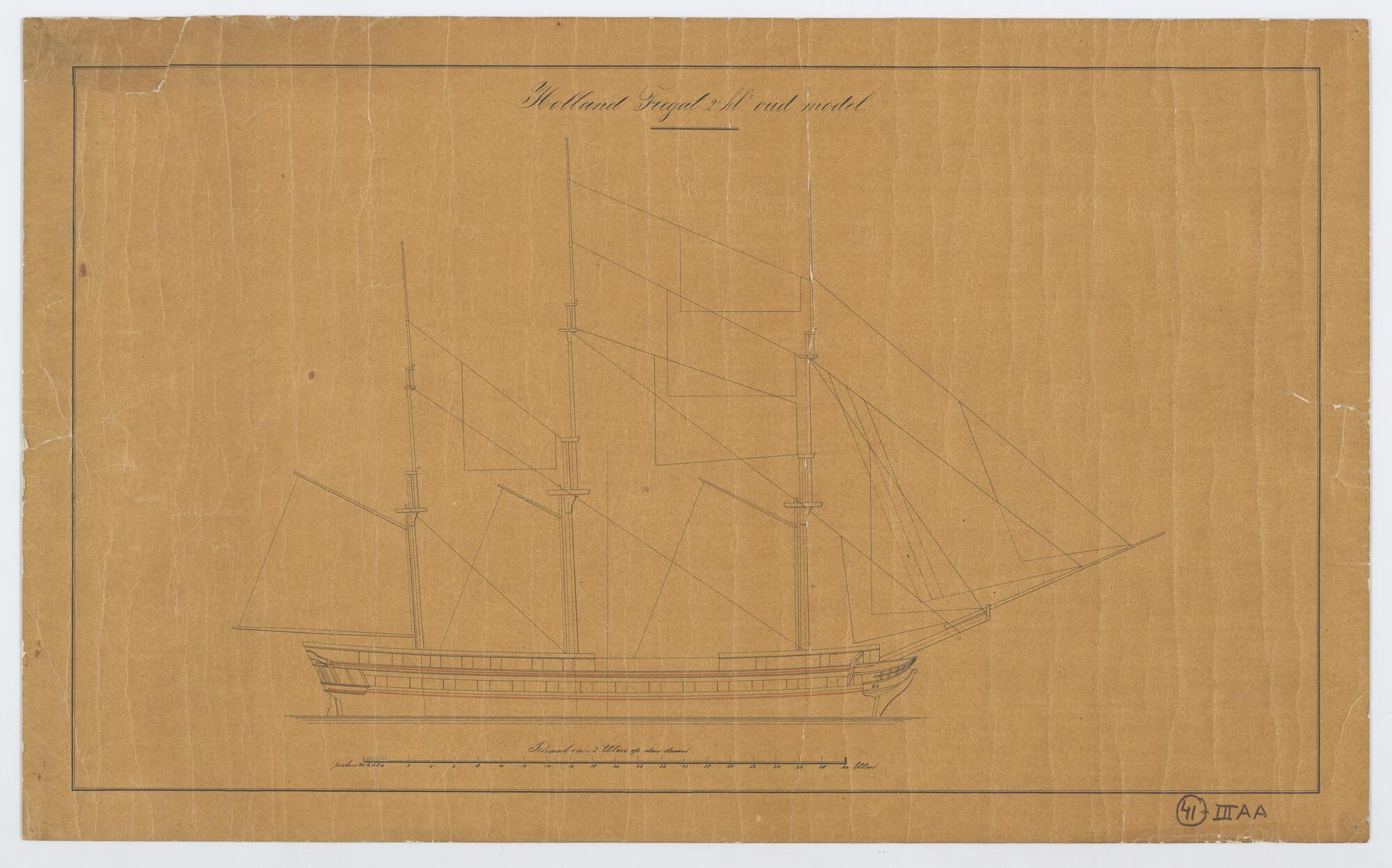 Zijaanzicht met tuigplan van het fregat Zr.Ms. Holland van 44 stukken.