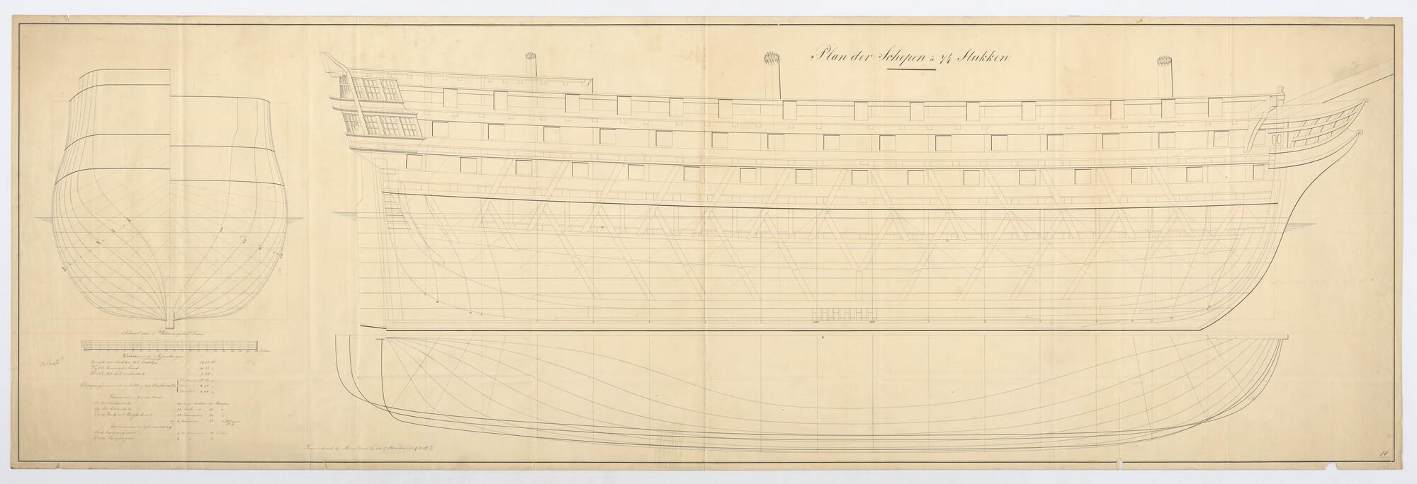 Zijaanzicht met dwarsverband constructie, spantenraam, waterlijnen van het linieschip Zr.Ms. 'De Ruyter' van 74 stukken 1838. Afmetingen 54.16 x 14.30 x 7.35 ellen.