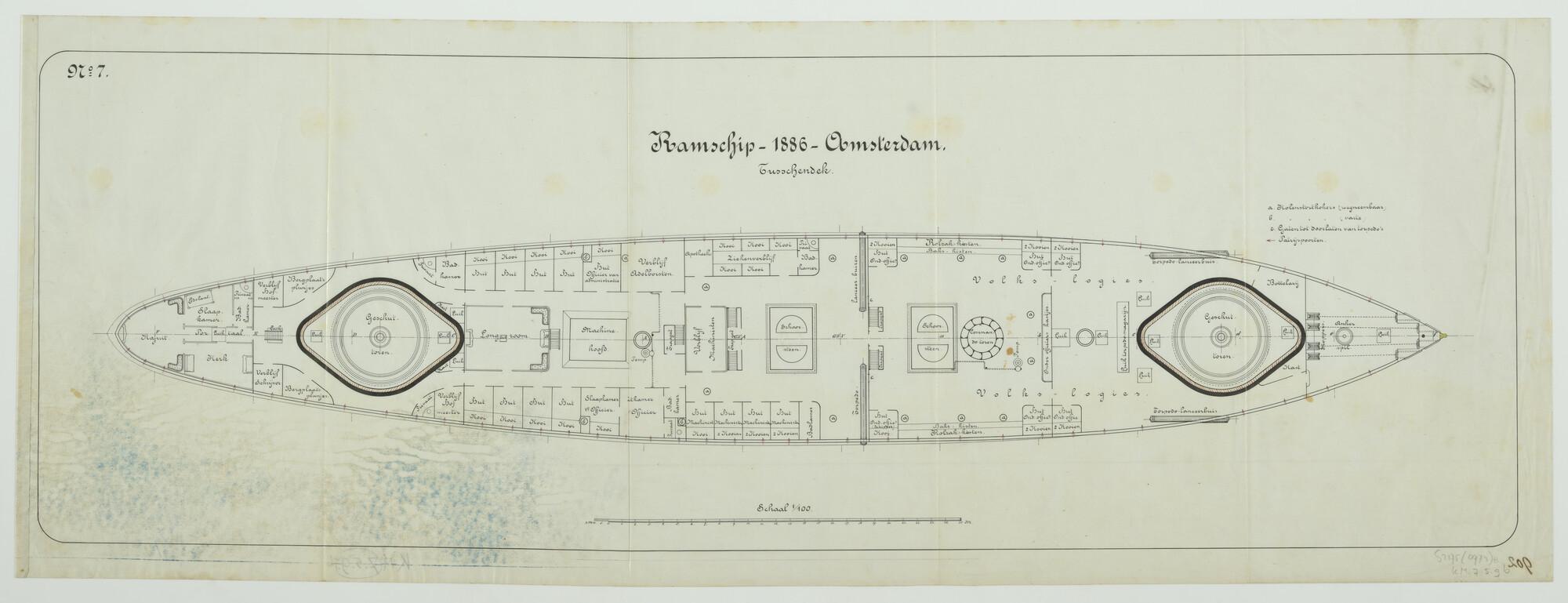 'Ontwerp ramschip "Amsterdam", 1886'. Tussendek. Ankerinrichting, geschuttorens, torpedolanceerbuizen, accommodatie, commandotoren, schoorstenen, machinehoofd. Originele tekening met transparant afdruk (schaal 1:100).