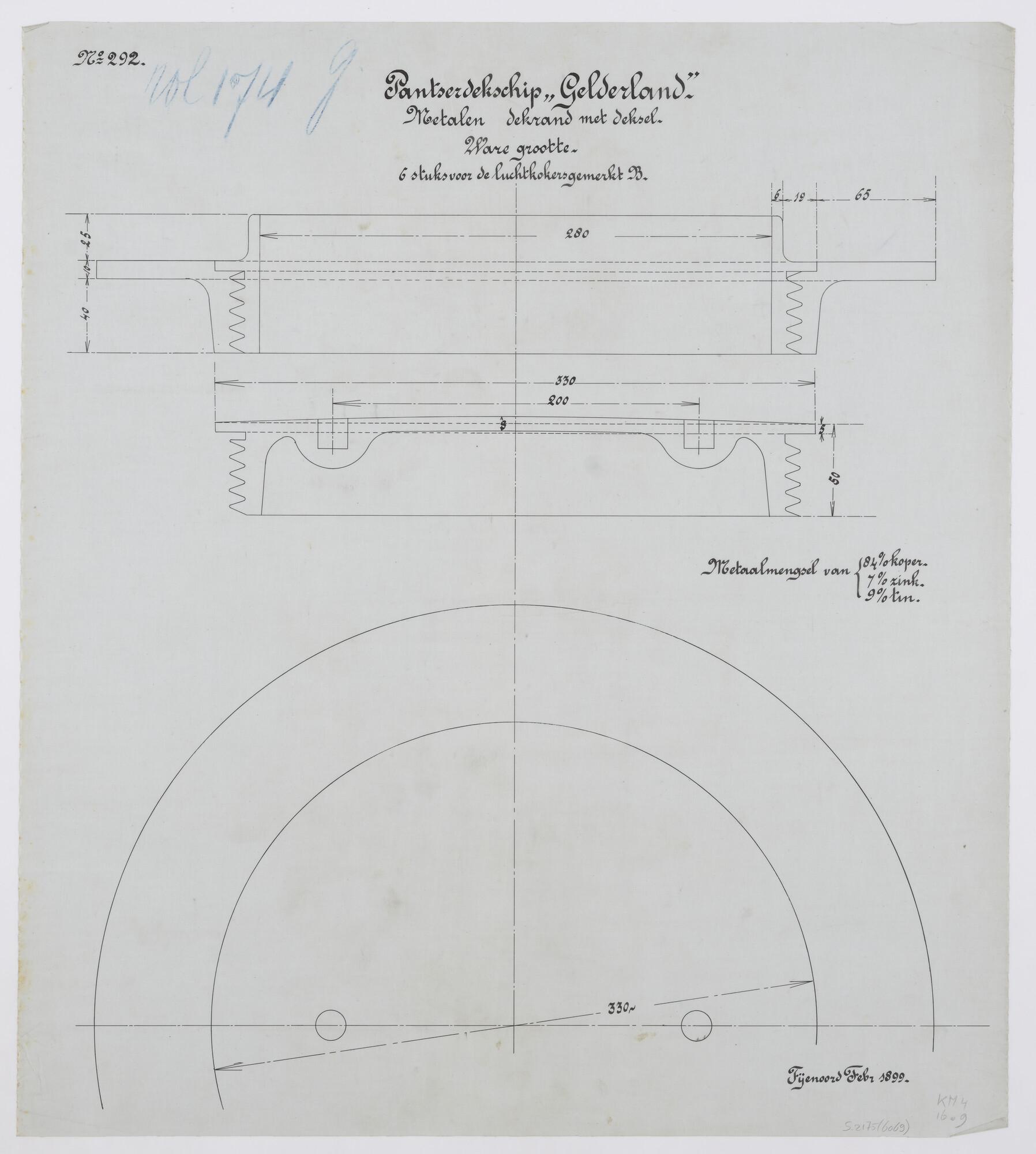 Technische tekening van metalen dekrand met deksel voor het pantserdekschip Hr.Ms. Gelderland op ware grootte. Zes stuks voor de luchtkoker gemerkt B (schaal 1:1).