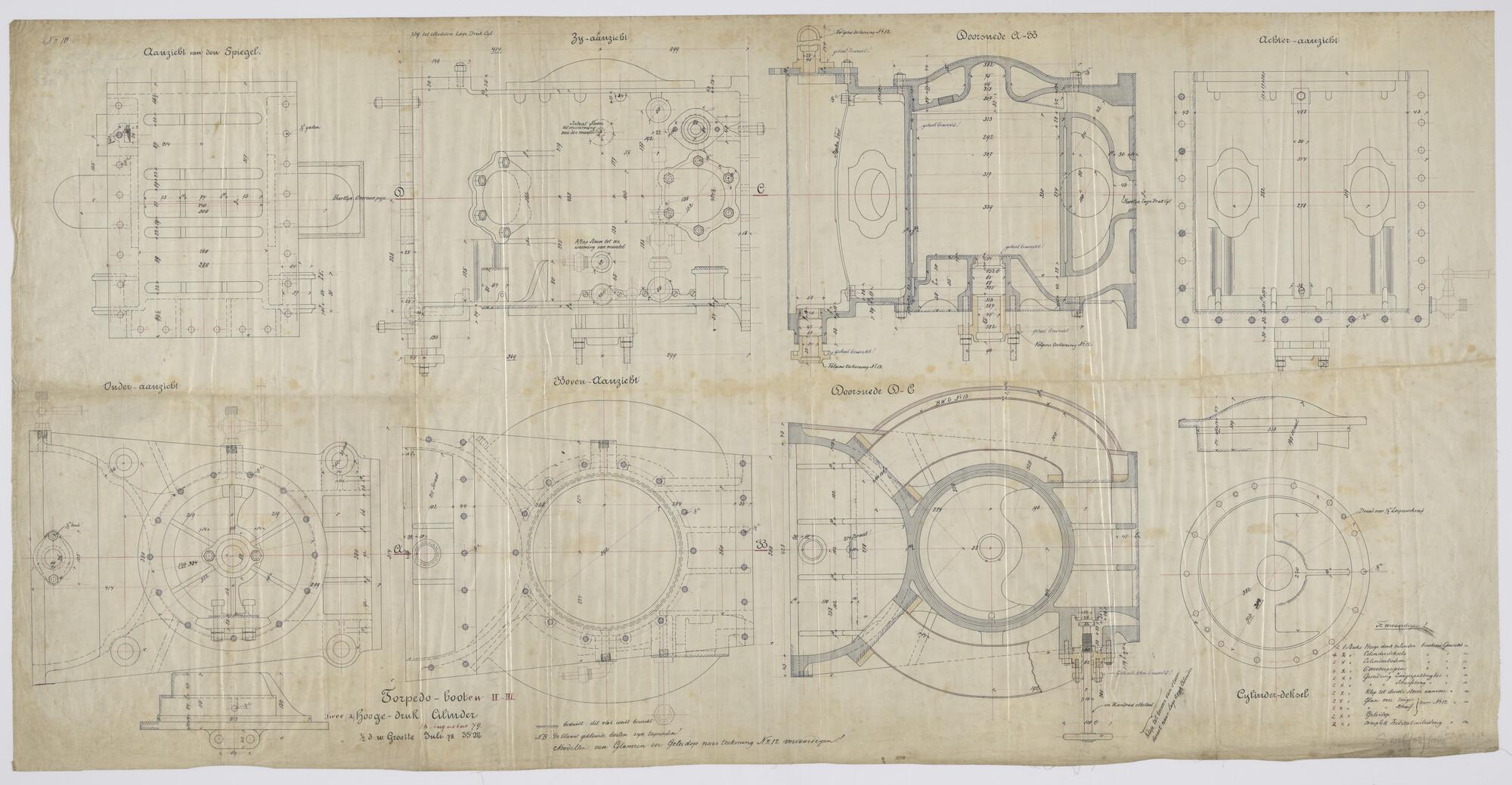 Tekening van hoge-druk cilinders, aan boord van spartorpedoboot Zr.Ms. II en V (schaal 1:4).