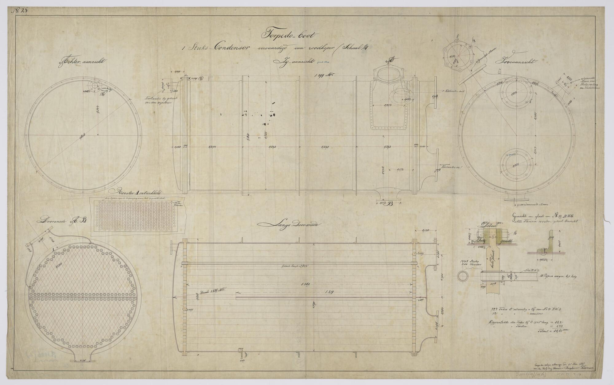 Tekening, zijaanzicht van een condensor in rood koper, aan boord van spartorpedoboot Zr.Ms. II en V (schaal 1:4).