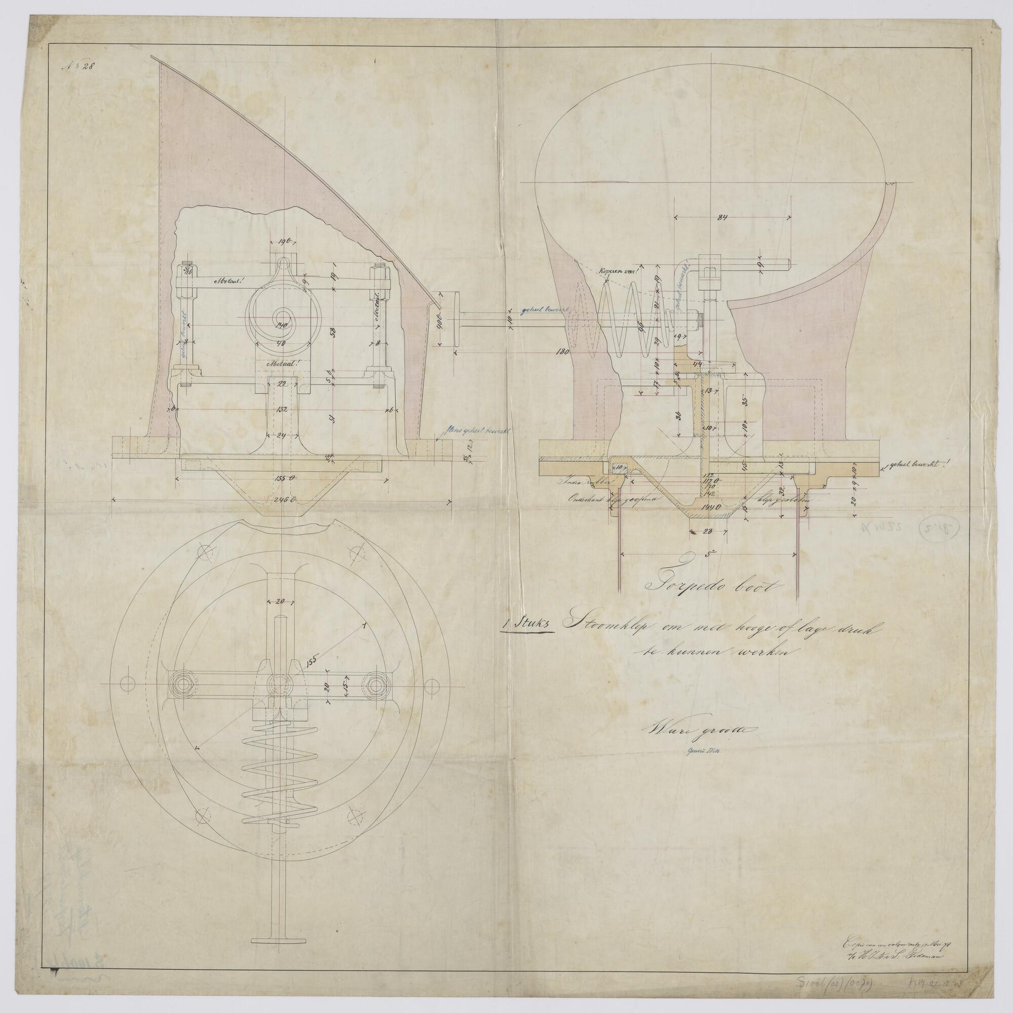 Tekening van een stoomklep om met hoge- of lage druk te kunnen werken, aan boord van spartorpedoboot Zr.Ms. II en V (schaal 1:4).